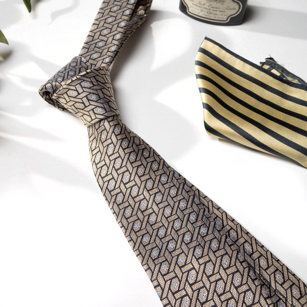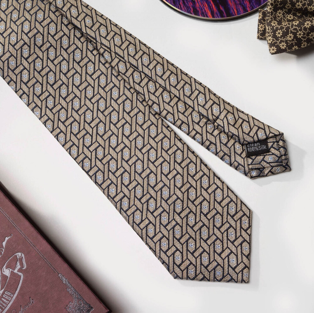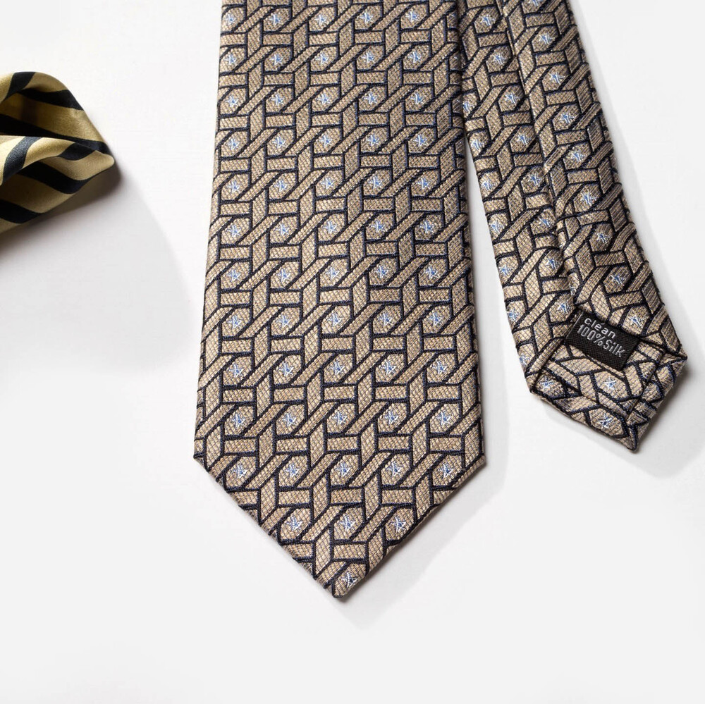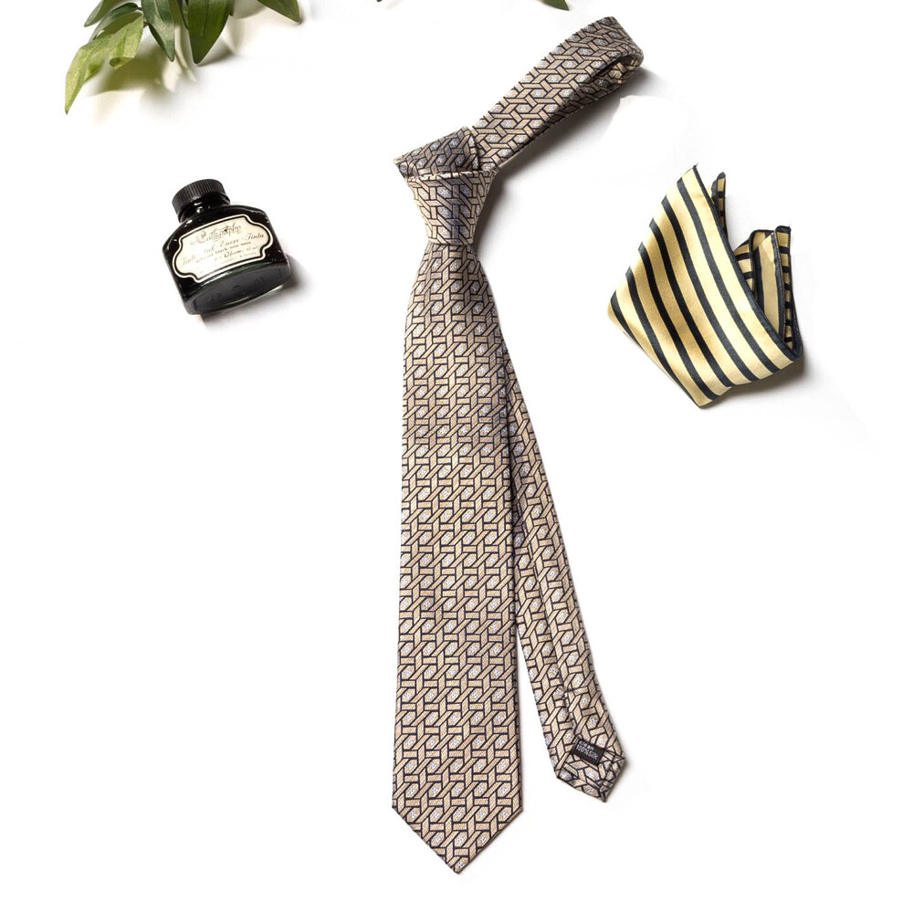 디테일한 직조의 색감 표현과 섬세하고도 밀도 높은 자수 패턴의 Premium Silk 원사로 여러 번 짜여진 패턴 제직이 스크래치에 강하며, 적당한 광택감으로 고급스러운 프리미엄 실크 타이입니다. 샴페인 골드 베이스 색감으로 다양한 색상의 수트와 잘 어우러지며 타이 하나로 완벽한 착장이 완성됩니다. 실버 톤의 기하학 무늬 패턴이 가미되어 실크 자수로 표현될 수 있는 가장 견고한 텍스쳐를 보여주는 소장 가치가 높은 타이입니다.