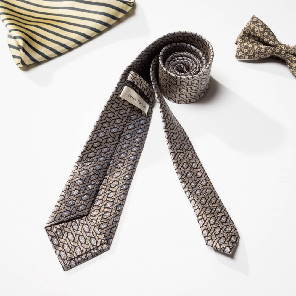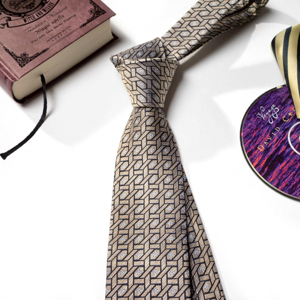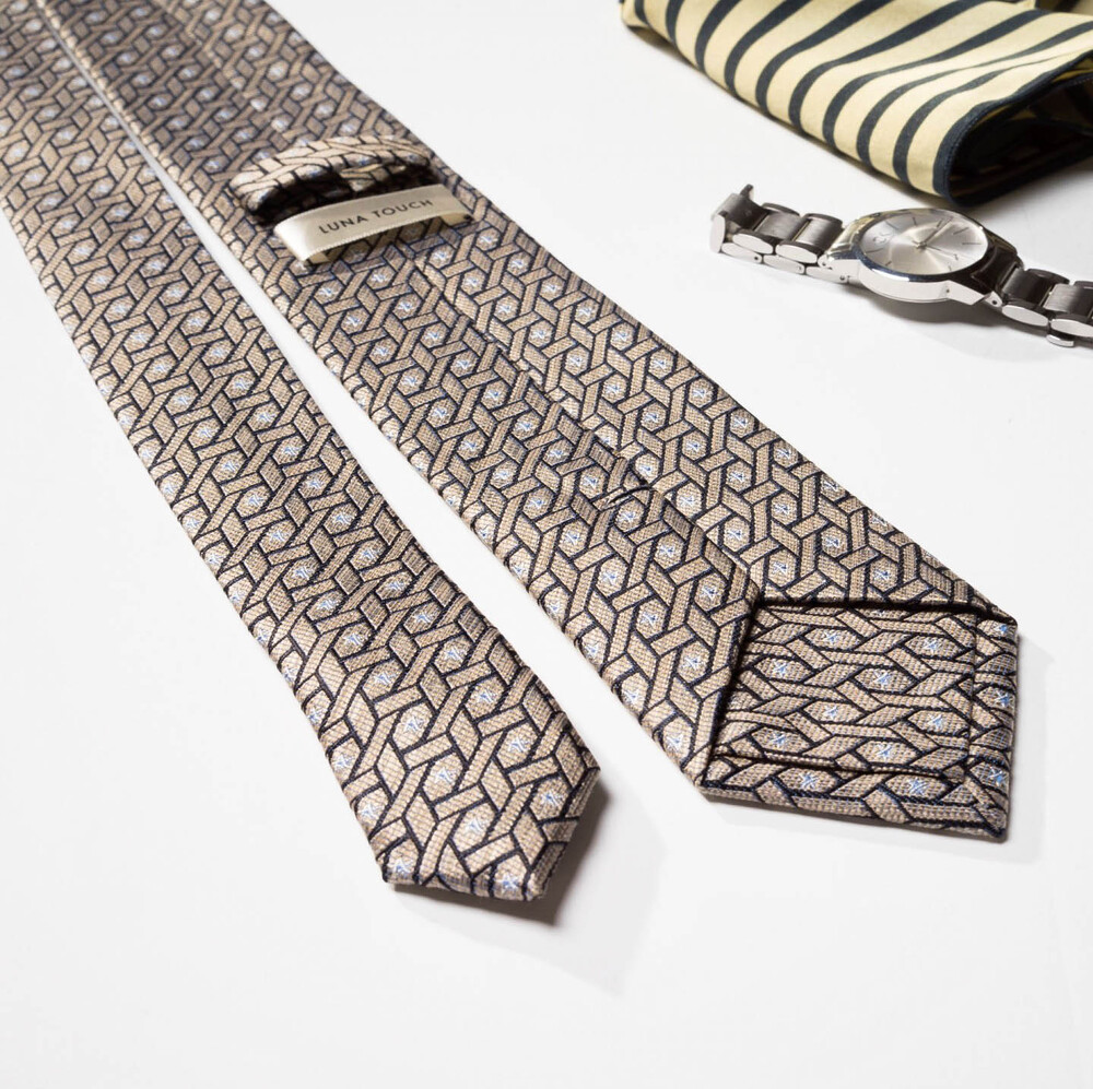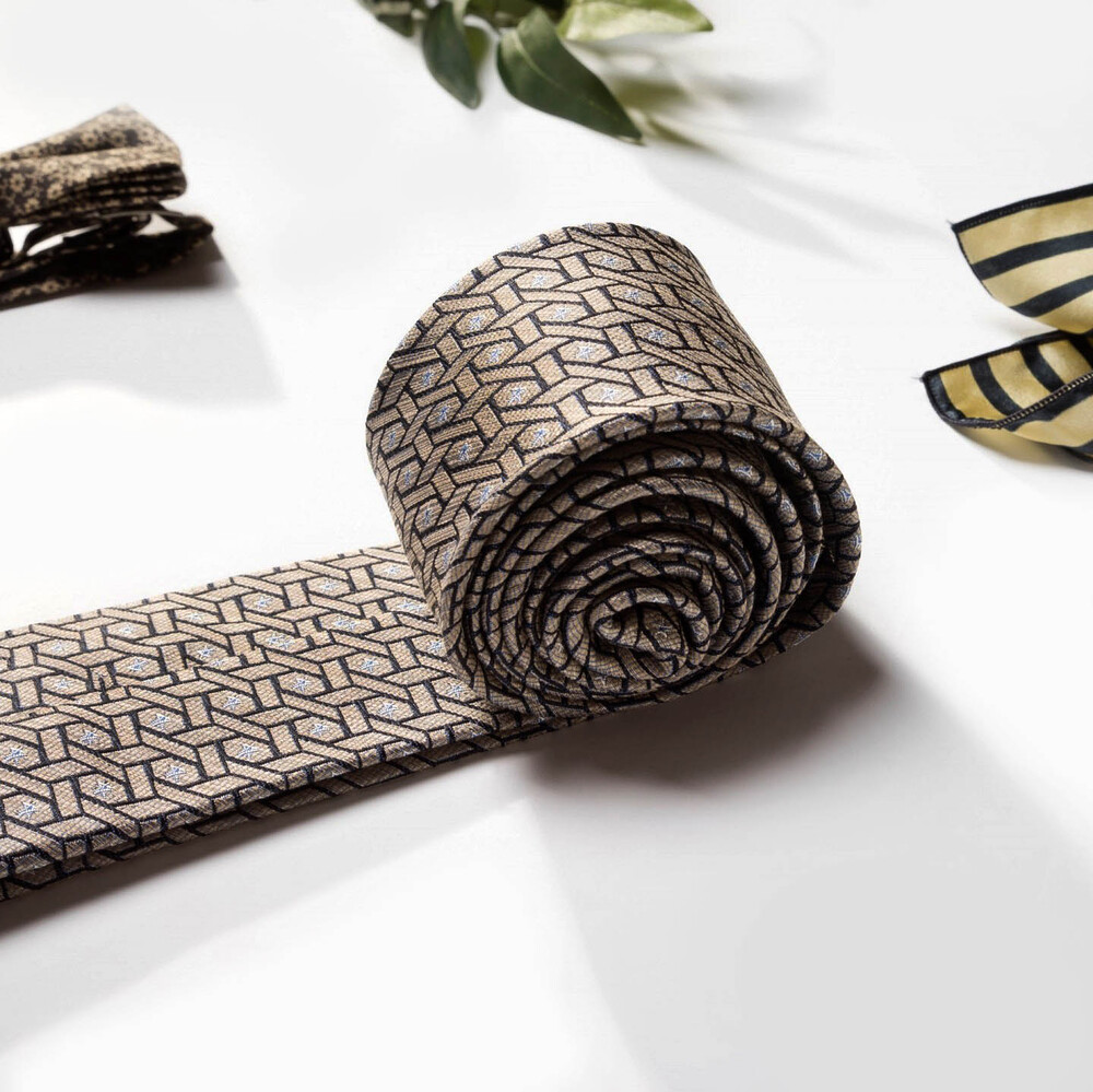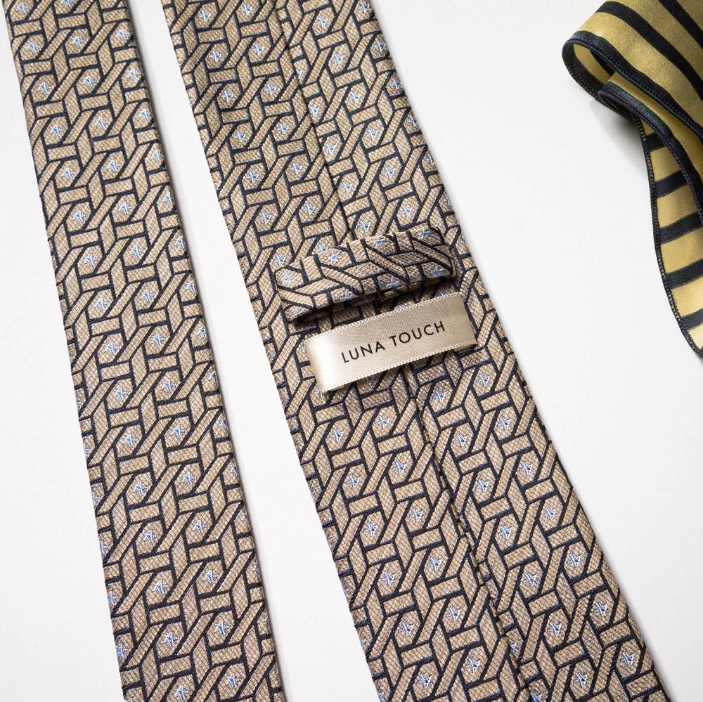 디테일한 직조의 색감 표현과 섬세하고도 밀도 높은 자수 패턴의 Premium Silk 원사로 여러 번 짜여진 패턴 제직이 스크래치에 강하며, 적당한 광택감으로 고급스러운 프리미엄 실크 타이입니다. 샴페인 골드 베이스 색감으로 다양한 색상의 수트와 잘 어우러지며 타이 하나로 완벽한 착장이 완성됩니다. 실버 톤의 기하학 무늬 패턴이 가미되어 실크 자수로 표현될 수 있는 가장 견고한 텍스쳐를 보여주는 소장 가치가 높은 타이입니다.