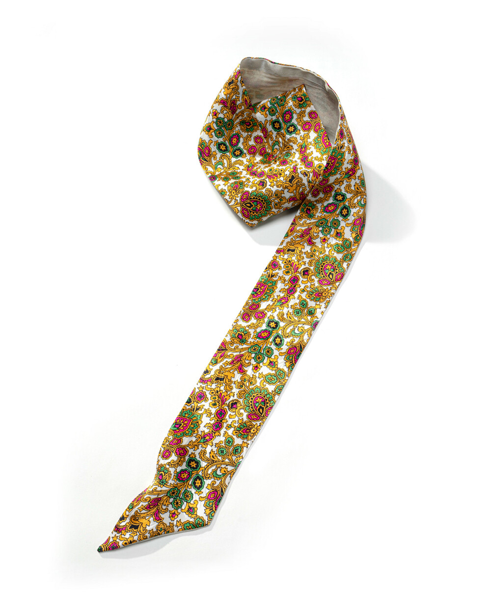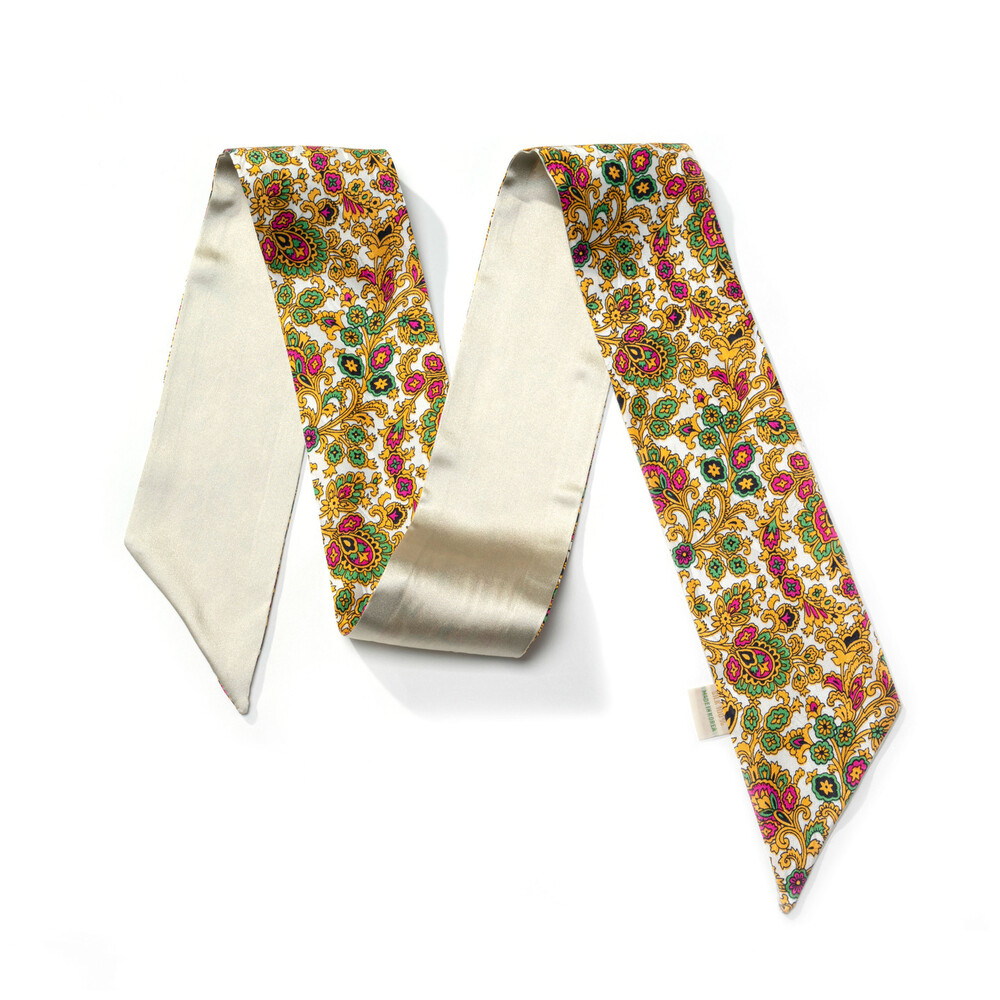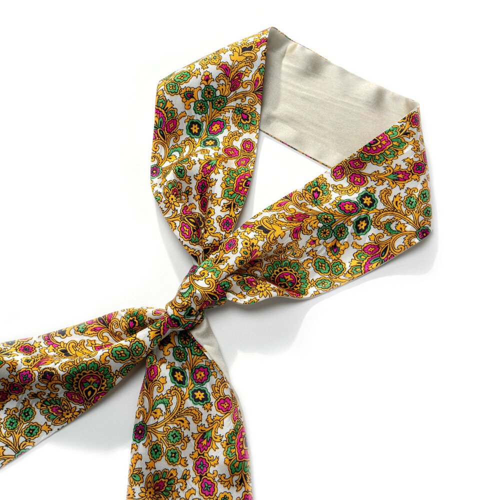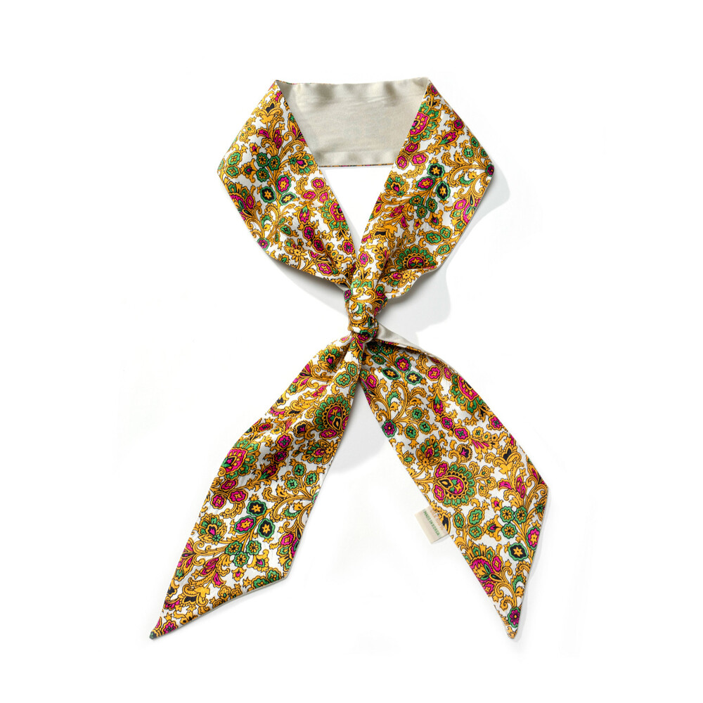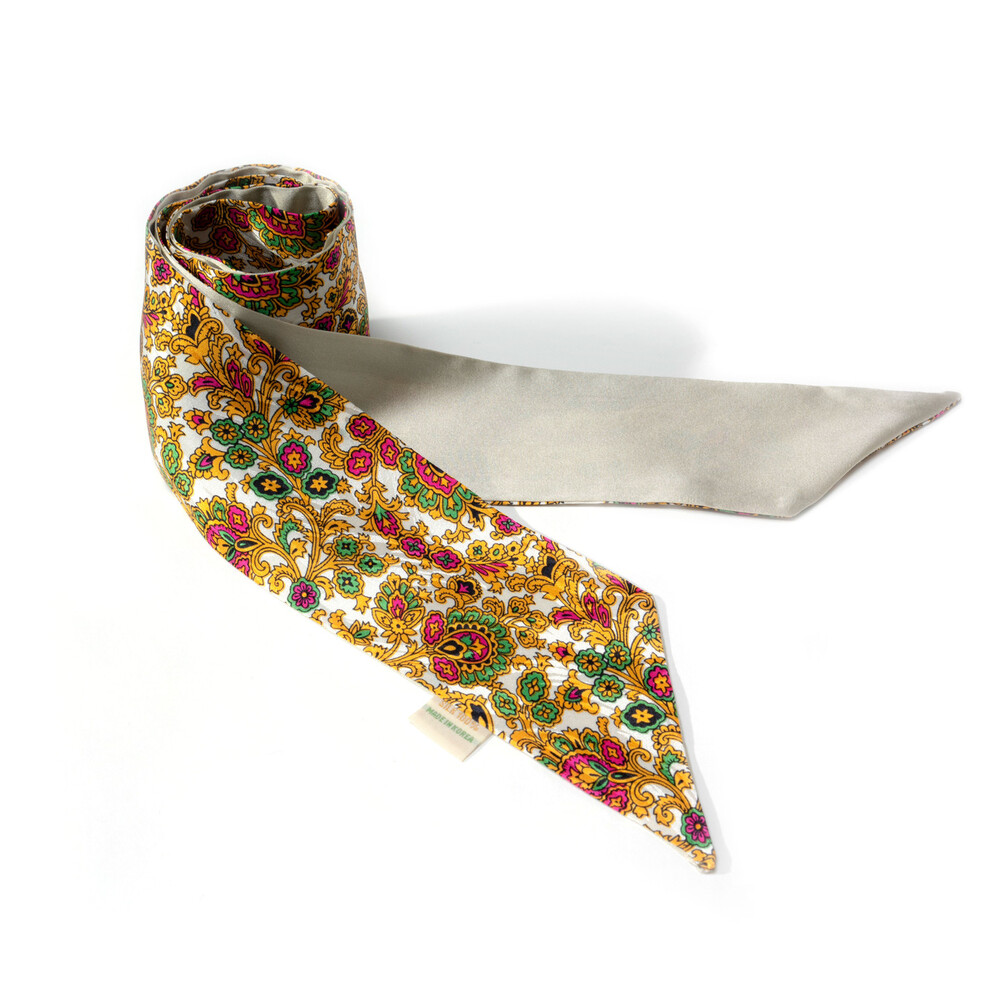 깔끔한 화이트 베이스에 골드, 그린, 다즐링 핑크 컬러의 다채로운 패턴 구성과 클래식하고 세련된 무드를 지닌 프리미엄 실크 100% 소재의 트윌리 스카프 입니다. 펄 아이보리 컬러의 솔리드 양면으로 리버시블 작업하여 한 가지 트윌리로 다양한 무드를 함께 연출하실 수 있으며, 가벼운 중량감과 유연하고 부드러운 텍스쳐로 착용감이 뛰어납니다.