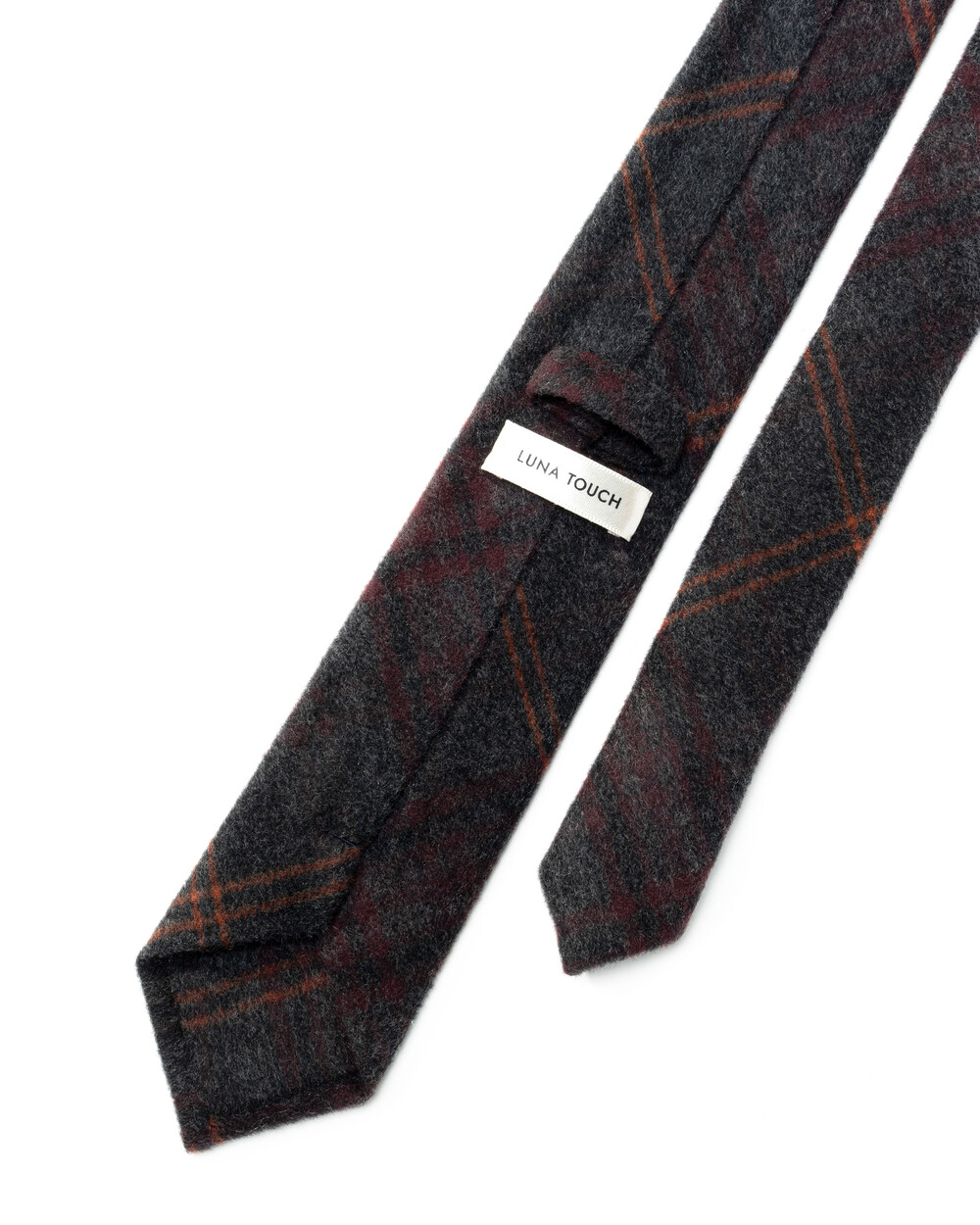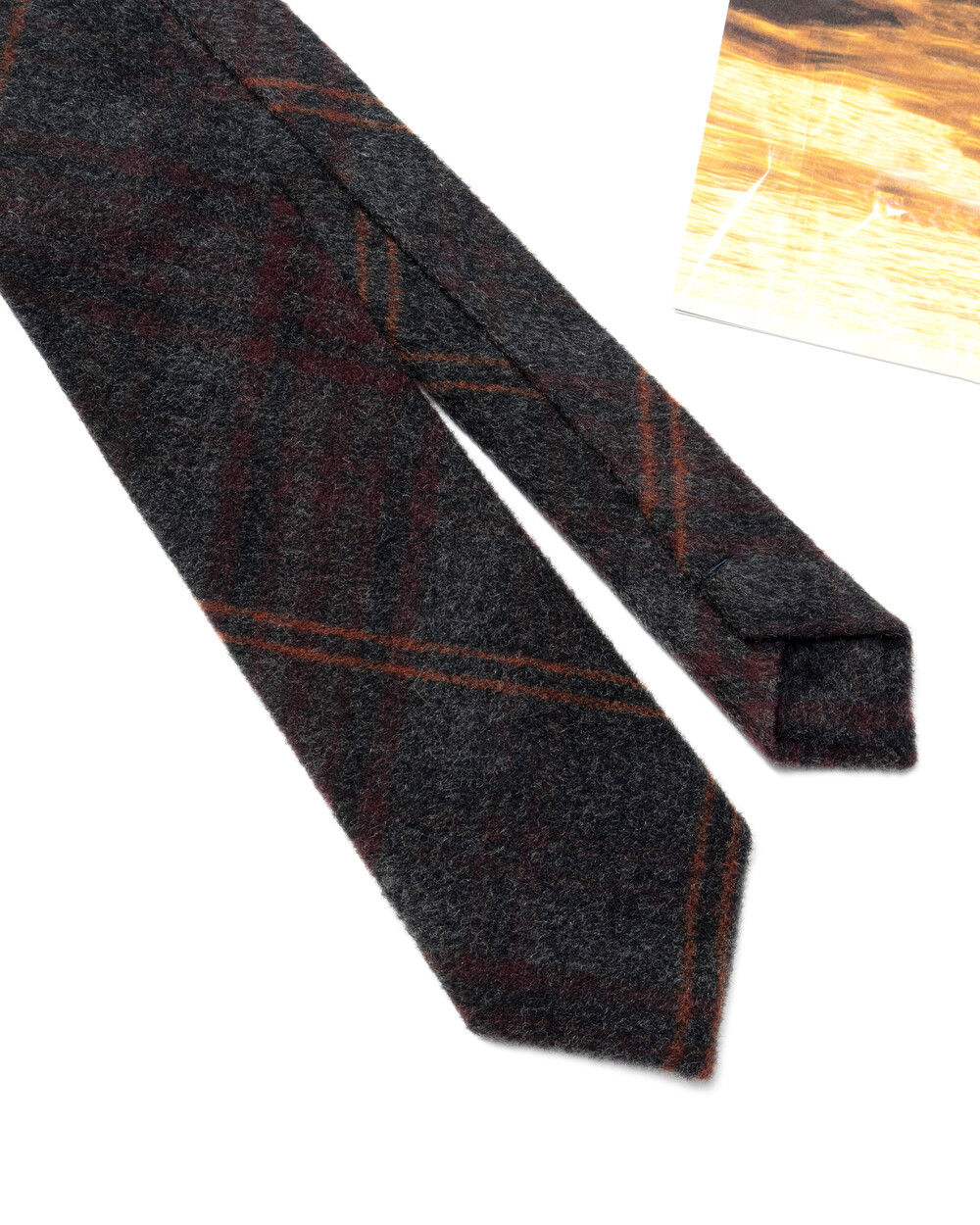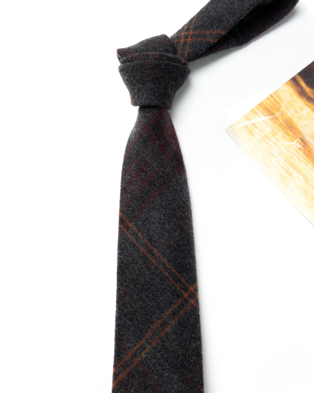 도톰하고 따뜻한 질감을 가진 이탈리안 캐시미어 Italy Cashmere 100% 소재의 모던체크 패턴 타이입니다. 딥 차콜 그레이 베이스에 버건디 컬러와오렌지 브라운의 체크 패턴이 가미되어 착용 시 클래식하면서도 프레피한 무드가 함께 연출됩니다.