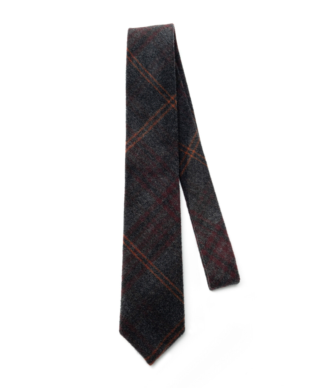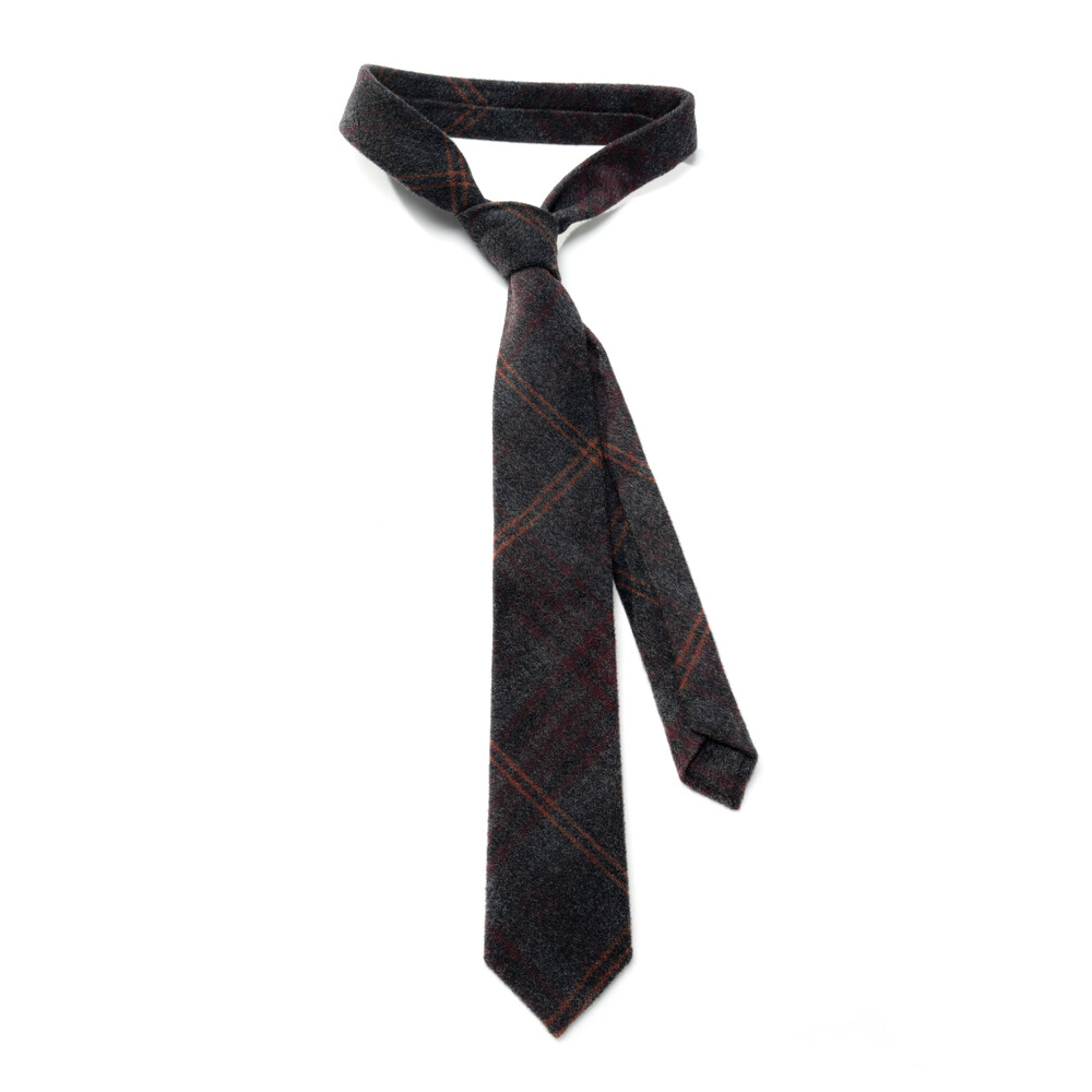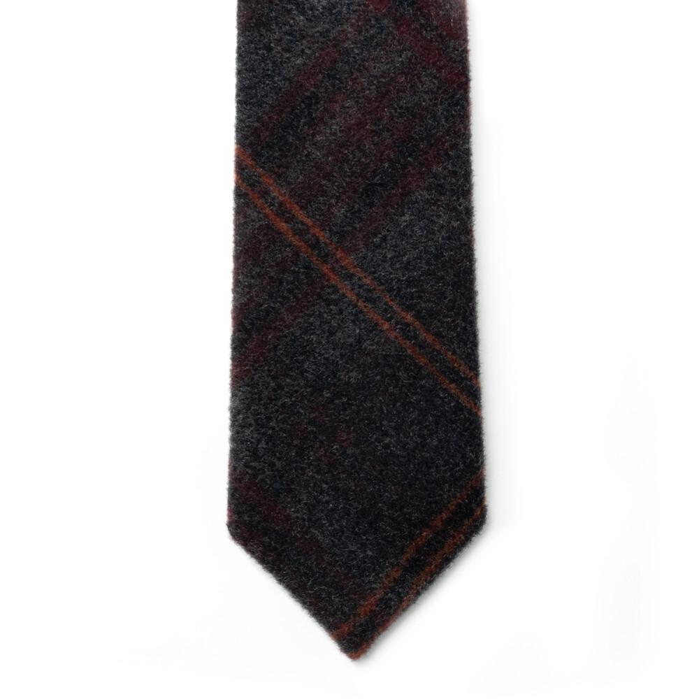 도톰하고 따뜻한 질감을 가진 이탈리안 캐시미어 Italy Cashmere 100% 소재의 모던체크 패턴 타이입니다. 딥 차콜 그레이 베이스에 버건디 컬러와오렌지 브라운의 체크 패턴이 가미되어 착용 시 클래식하면서도 프레피한 무드가 함께 연출됩니다.