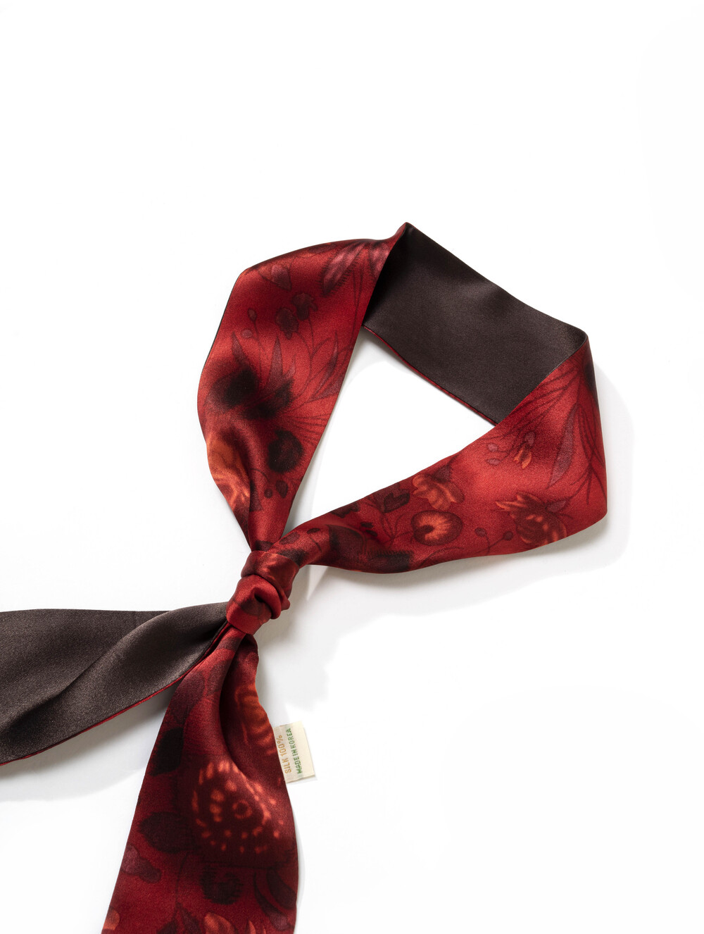 진홍빛 플로랄 색감을 담아낸 스칼렛 레드 컬러의 트윌리 입니다. 딥한 브라운 컬러와 함께 양면으로 착용 가능하여 두 가지 무드로 연출하실 수 있습니다. 100% SILK 소재로 작업하여 흐르듯 부드럽고 유연한 텍스쳐이며 이지적인 분위기의 플라워 패턴이 더해져 더욱 매력적으로 착용됩니다.