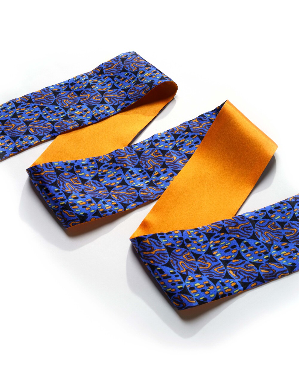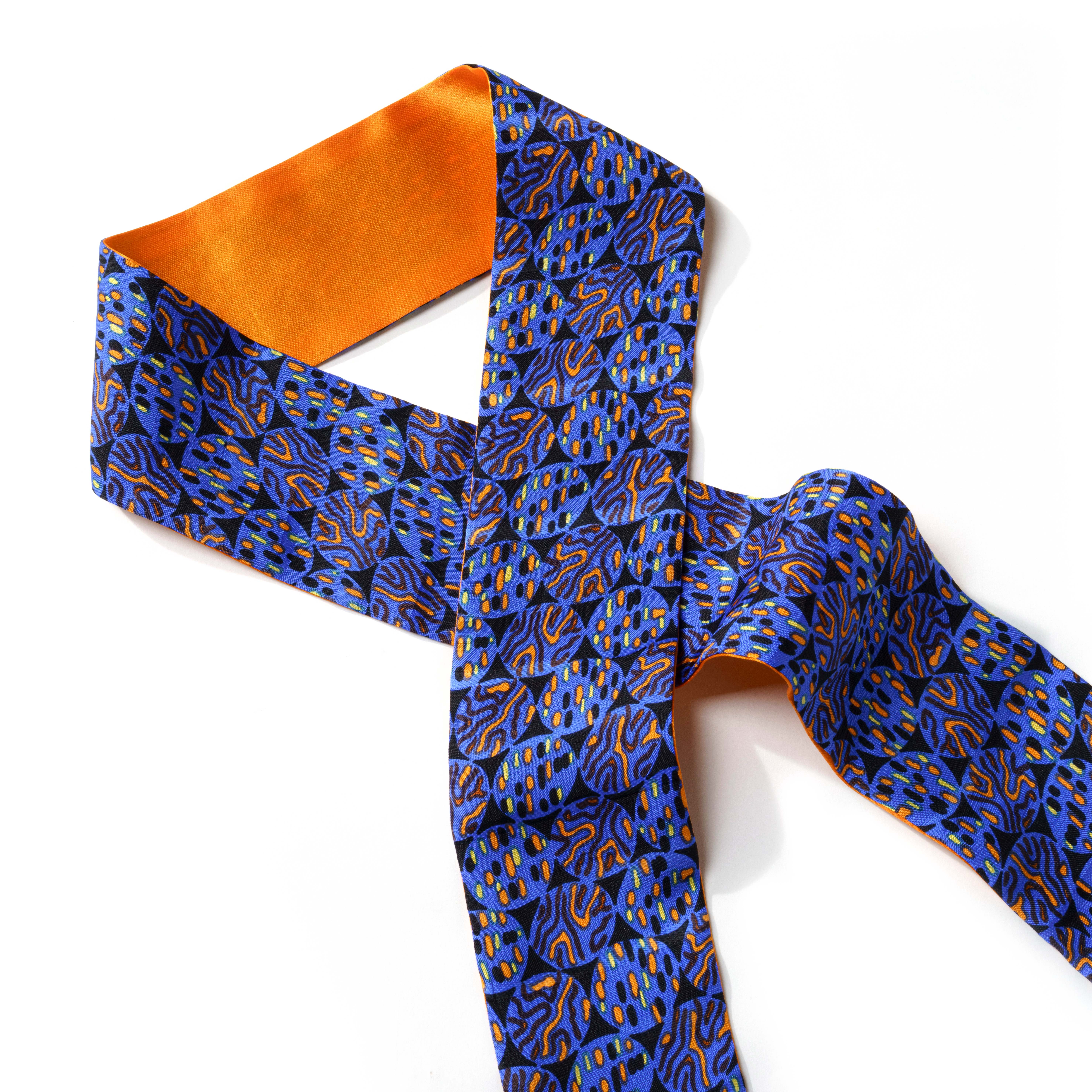 키치한 팝 아트워크 패턴이 매력적인 프리미엄 실크 트윌리 스카프 입니다. 실크 100% 소재로 부드러우며 광택감이 적은 내추럴한 텍스쳐로 제작됩니다. 채도감 있는 블루 컬러를 베이스로 드로잉 패턴과 탠저린 컬러의 솔리드 실크로 양면 제작됩니다. 포멀한 룩과 함께 캐주얼 룩에도 자연스럽게 매치하기 좋은 디자인 입니다.