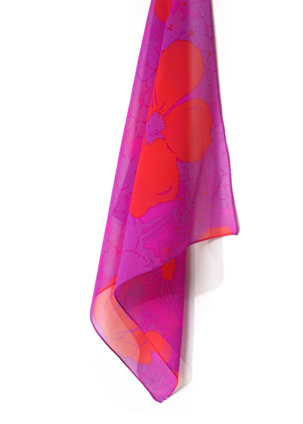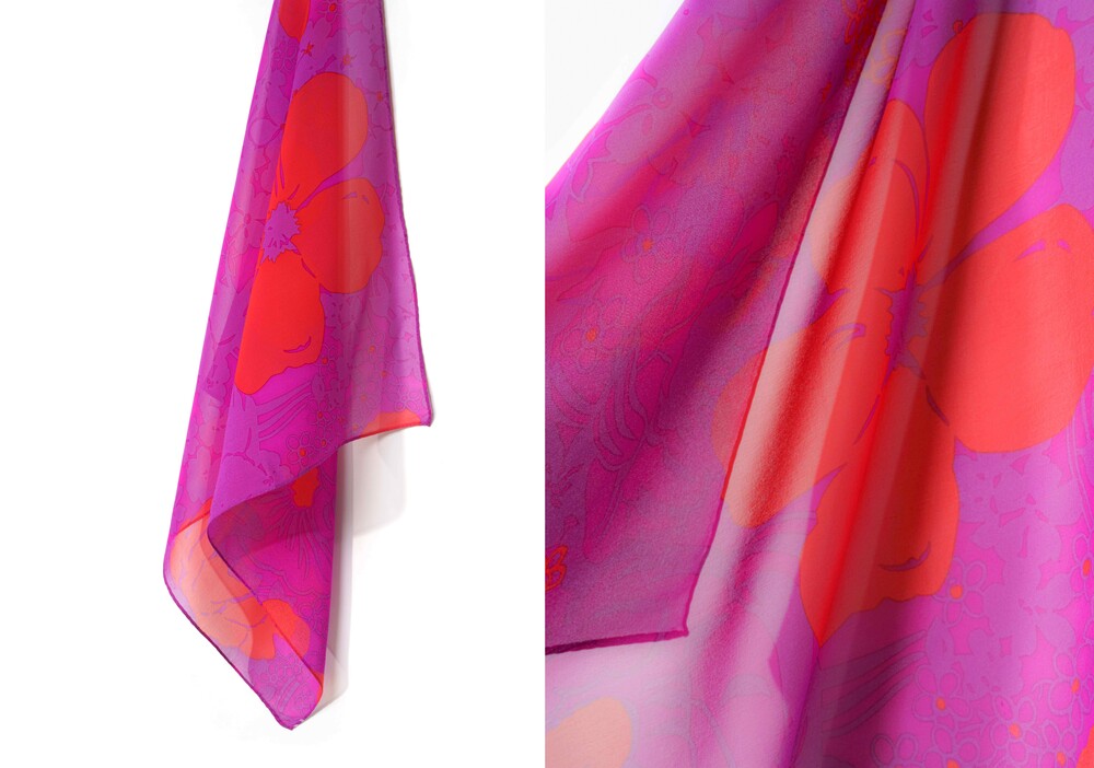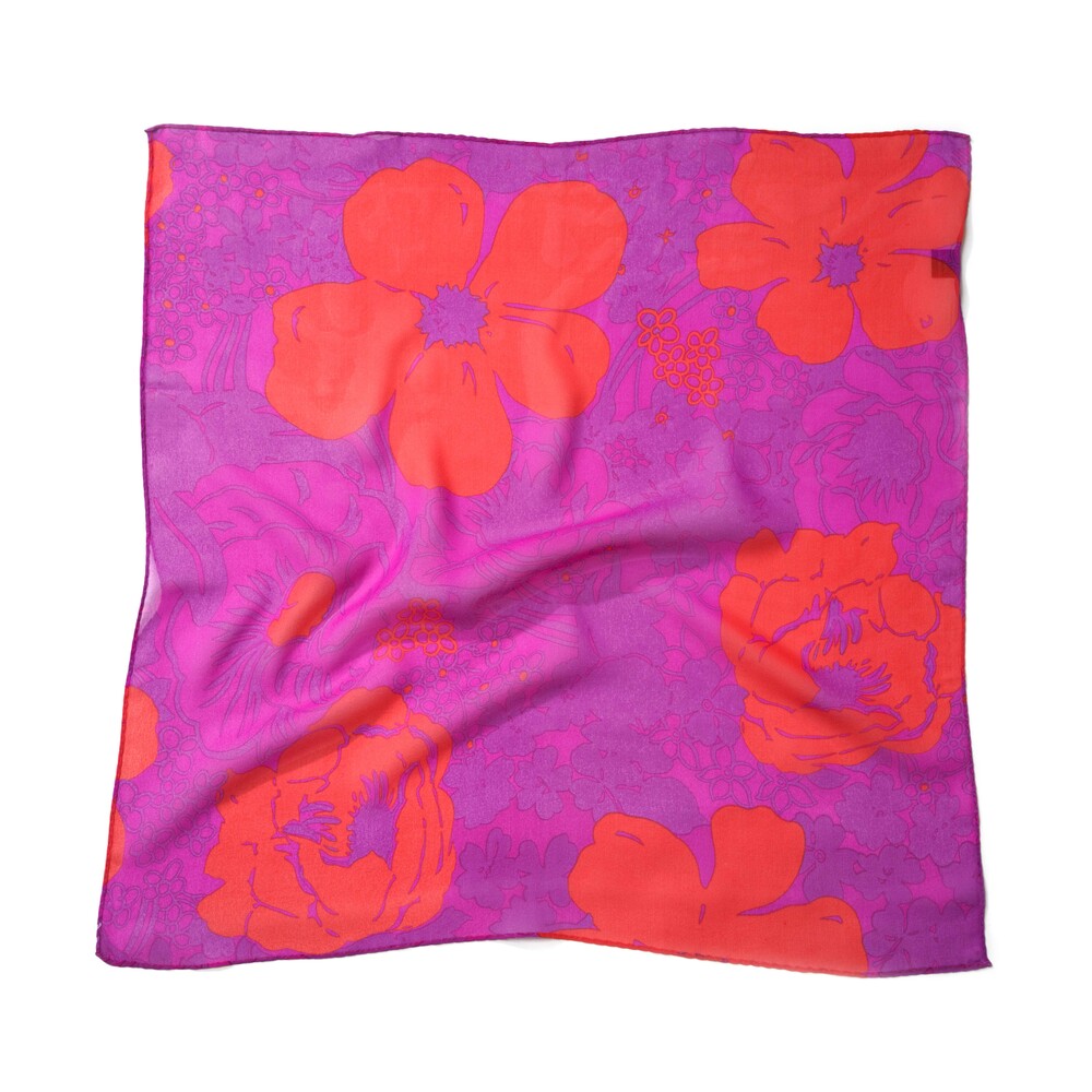 매력적인 마젠타 베이스와 오렌지 컬러의 플라워 패턴의 색감 조화가 돋보이는 실크 스카프 입니다. 다양한 실루엣으로 착용이 가능한 스퀘어 형태로 제작됩니다. 100% SILK 소재로 부드러운 터칭감을 선사하며, 가볍게 흐르는 질감의 쉬폰 실크로 사계절 시즌 내내 착용 가능합니다.