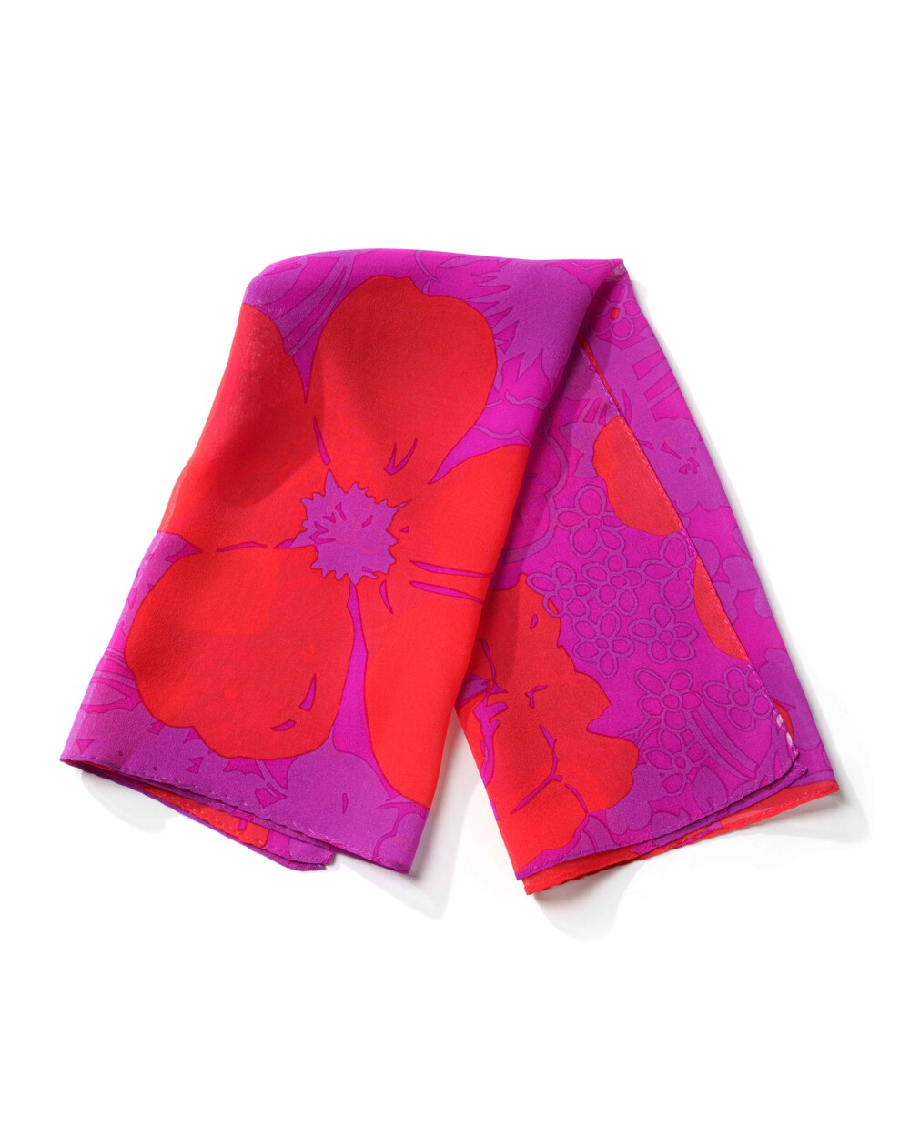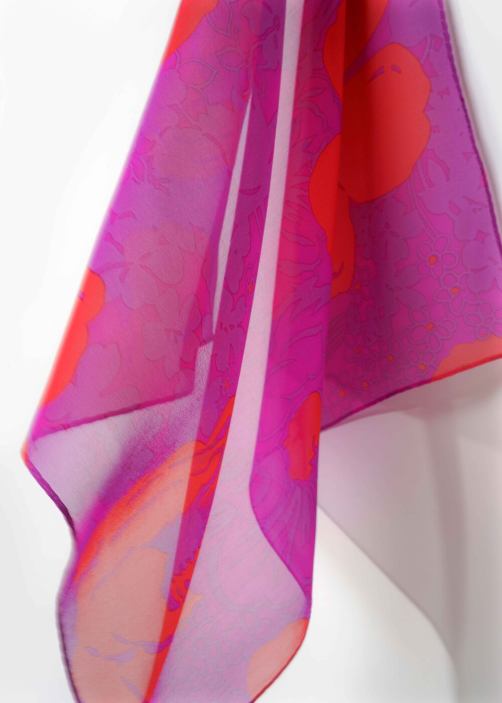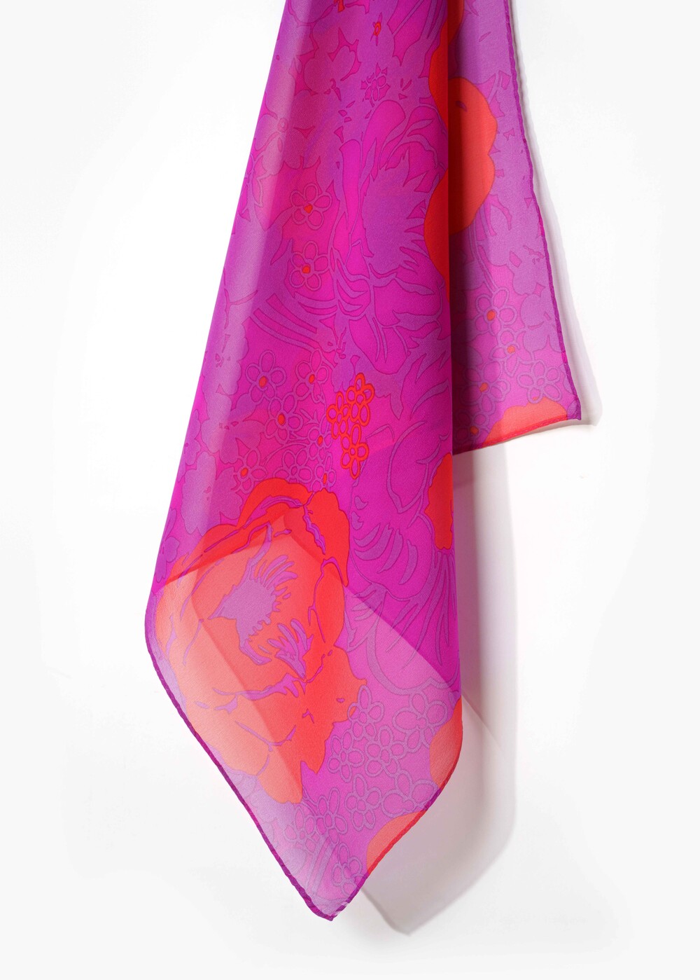 매력적인 마젠타 베이스와 오렌지 컬러의 플라워 패턴의 색감 조화가 돋보이는 실크 스카프 입니다. 다양한 실루엣으로 착용이 가능한 스퀘어 형태로 제작됩니다. 100% SILK 소재로 부드러운 터칭감을 선사하며, 가볍게 흐르는 질감의 쉬폰 실크로 사계절 시즌 내내 착용 가능합니다.