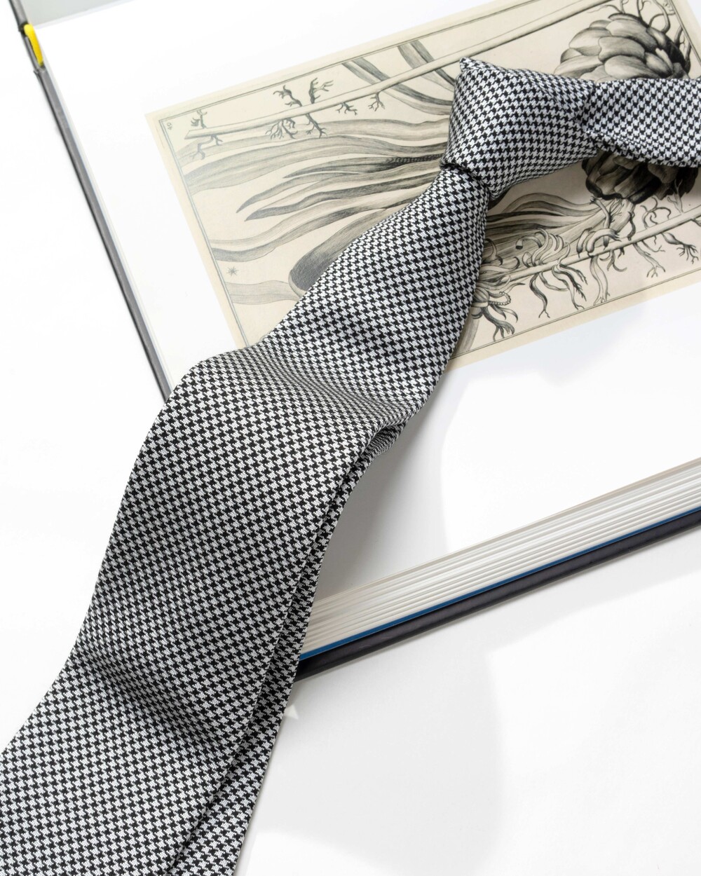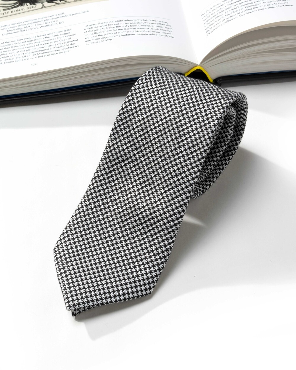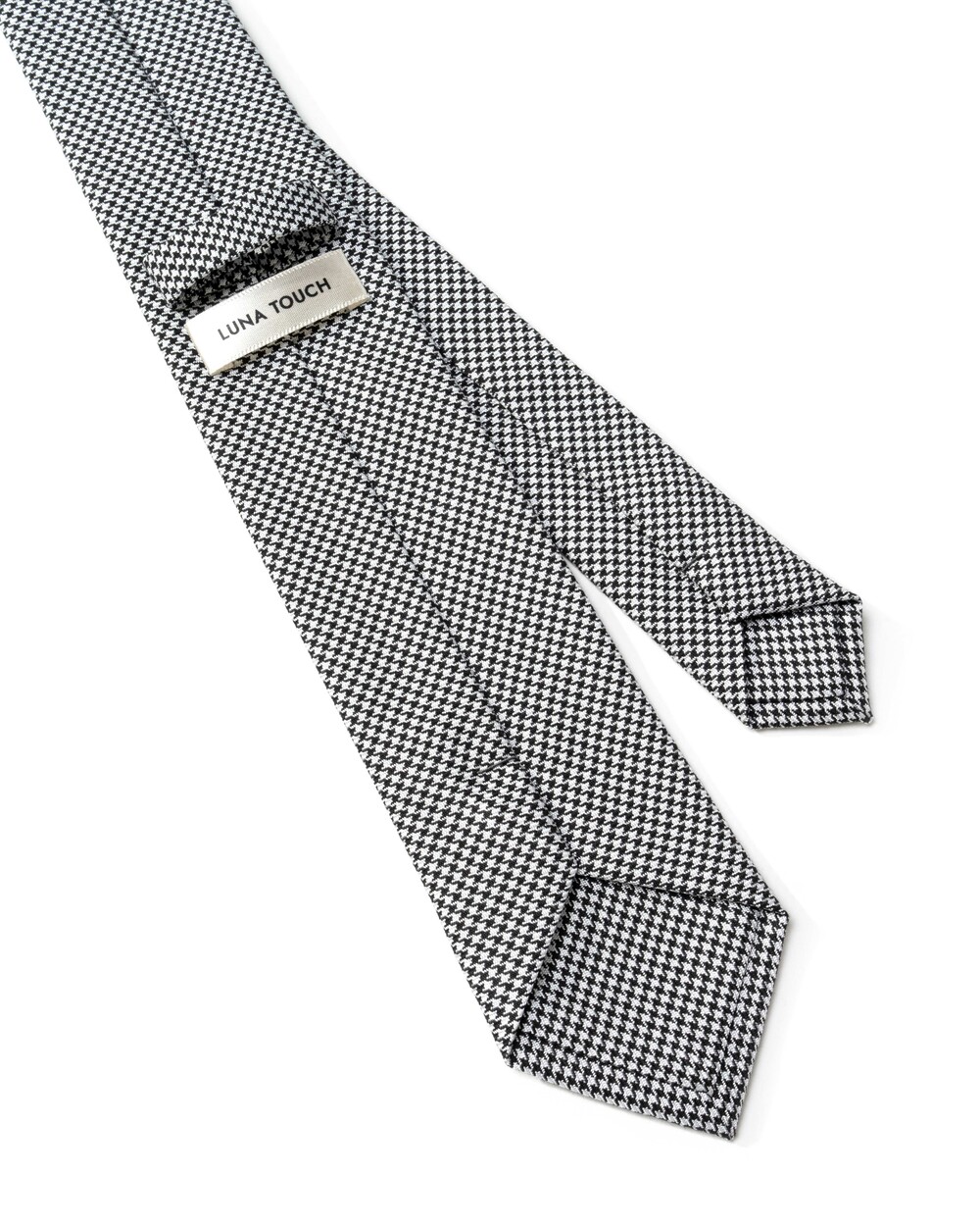 블랙 앤 화이트 조합의 클래식 하운드 투스 체크 타이입니다. 미니멀하게 구성된 섬세한 직조의 하운드 투스 패턴으로 군더더기 없는 깔끔한 텍스쳐를 선사합니다. 사계절 착용이 가능한 라이트한 질감의 울 블렌드 소재로 포멀한 룩부터 세미 캐주얼까지 언제 어디서나 멋스러운 룩을 완성할 수 있습니다.