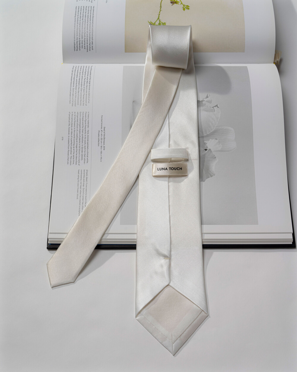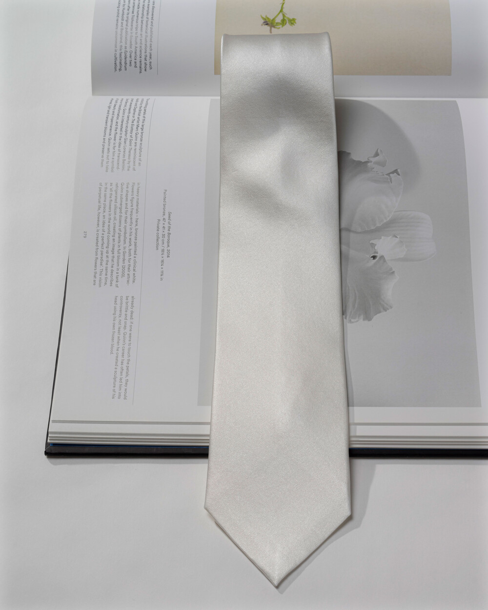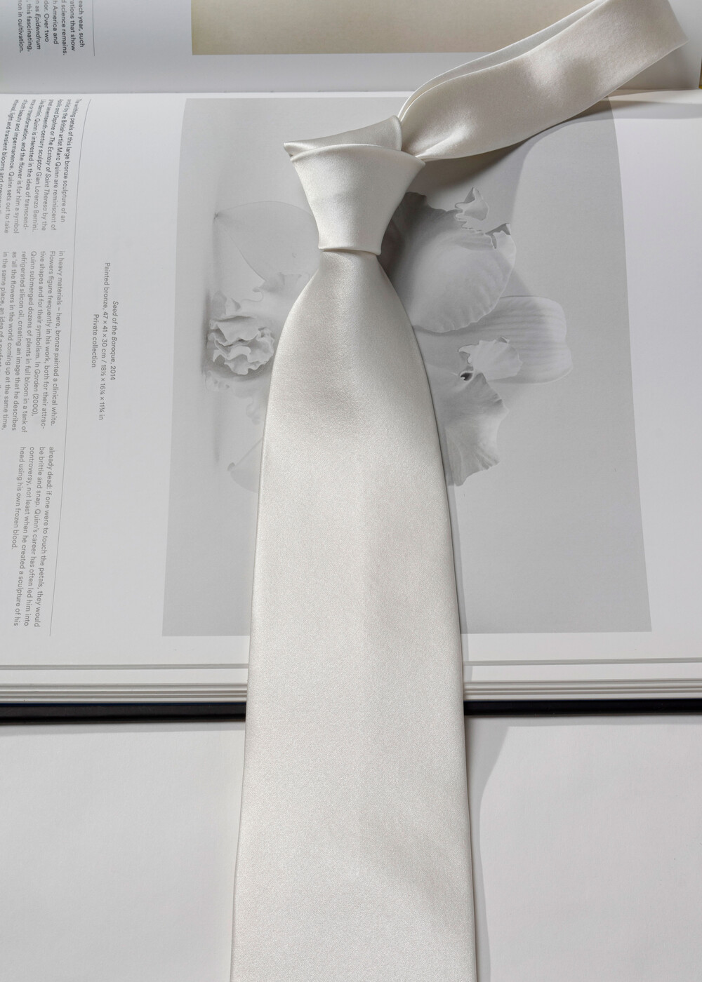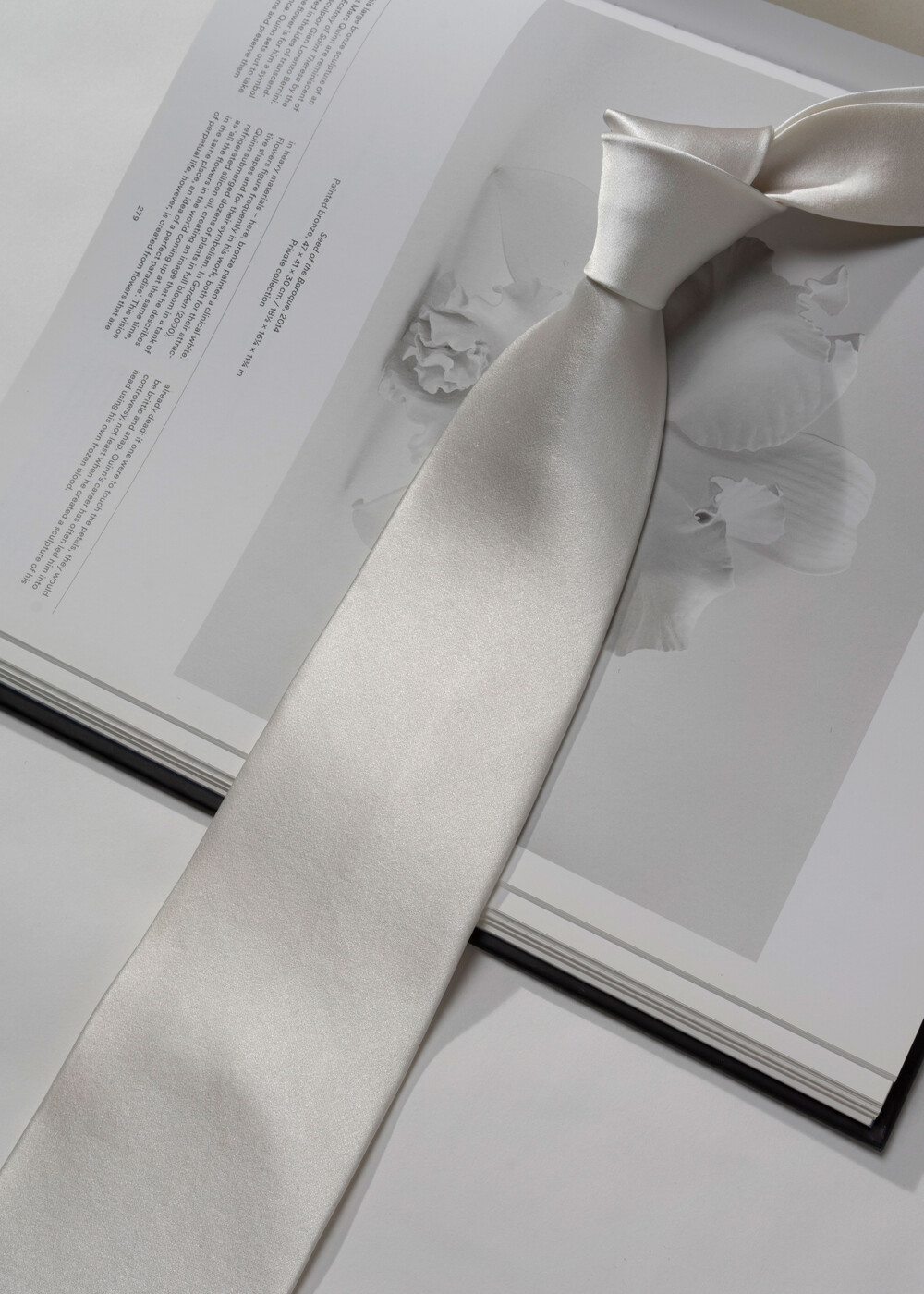 스테디 솔리드 시그니처 타이 시리즈 입니다. 깊은 명도와 채도로 조율된 미색빛이 은은히 감도는 클래식 화이트 컬러의 실크 원사로 제작됩니다. 섬세하고 부드러운 100% PURE SILK 소재의 가벼운 중량과 질감으로 사계절 시즌 다양한 착장과 활용하기 좋으며, 유연함을 가진 부드러운 텍스쳐는 멋스러운 매듭을 완성시켜 줍니다. 웨딩 데이 타이로 추천 드립니다.