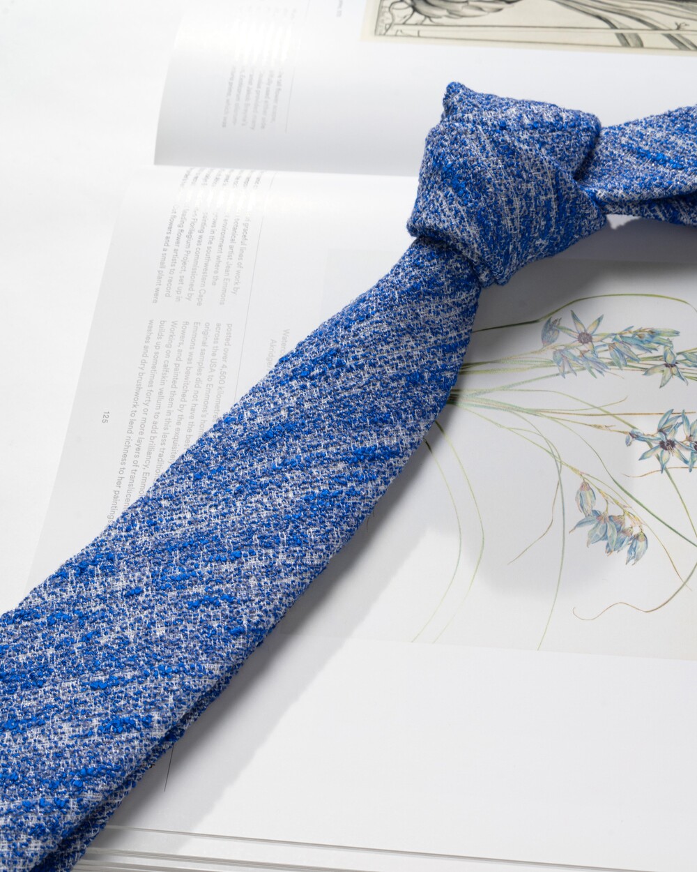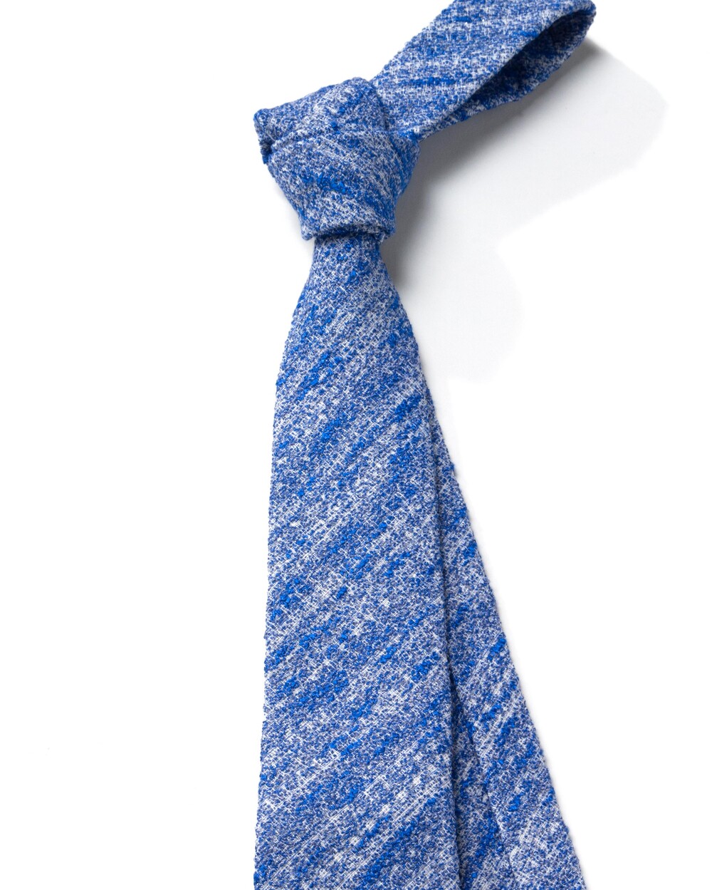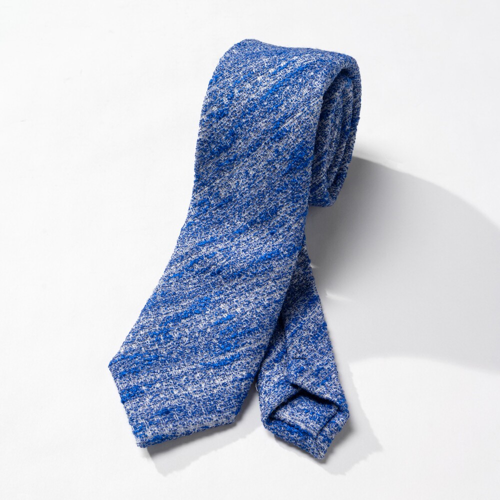 경쾌한 색감이 멋스러운 부클레 니티드 타이 입니다. 블루와 화이트 컬러의 울과 린넨 원사가 촘촘하고 강한 고리 형태의 직조로 짜여져 도톰하고 입체감 있는 질감을 선사합니다. 쉽게 찾아볼 수 없는 특별한 매력을 지닌 타이입니다.