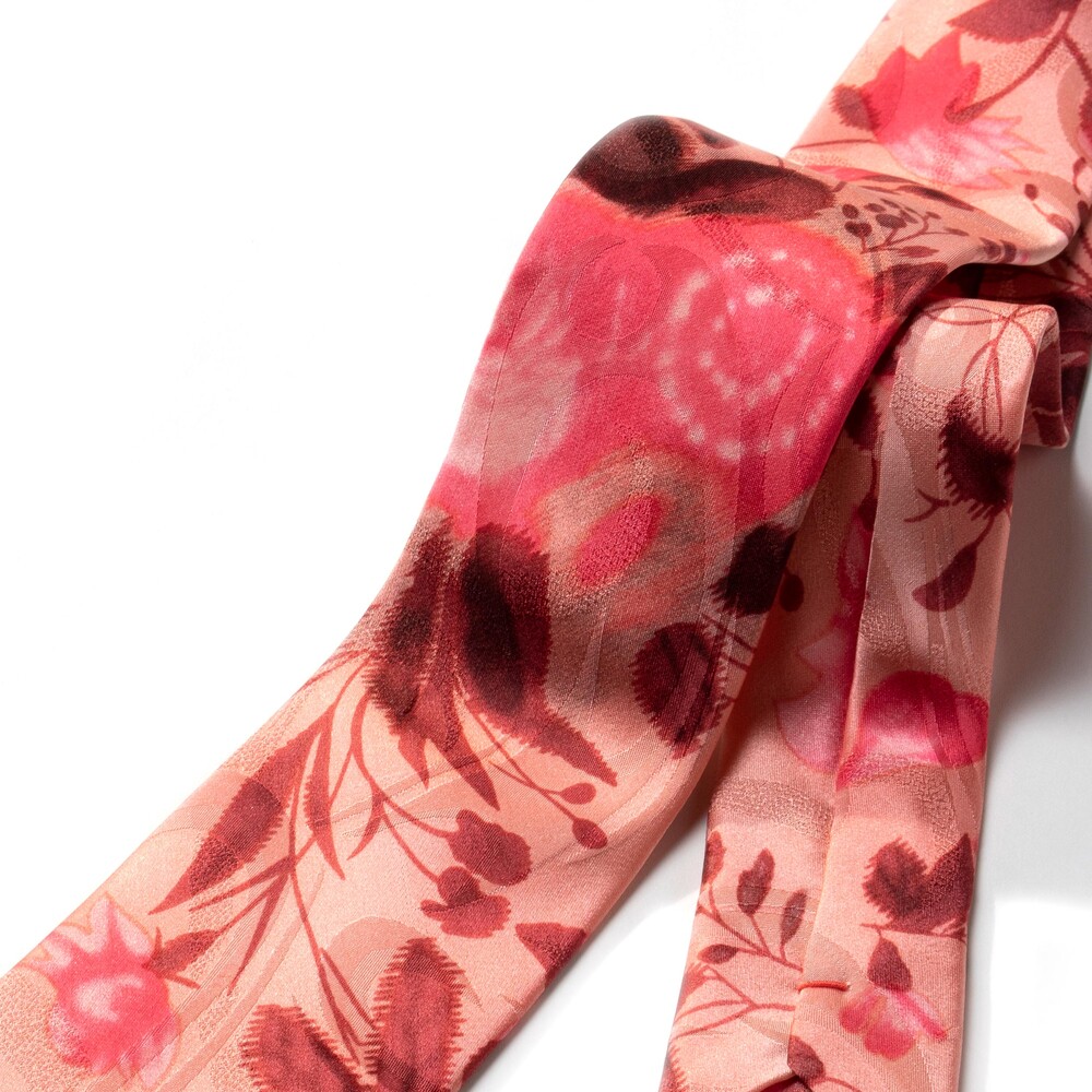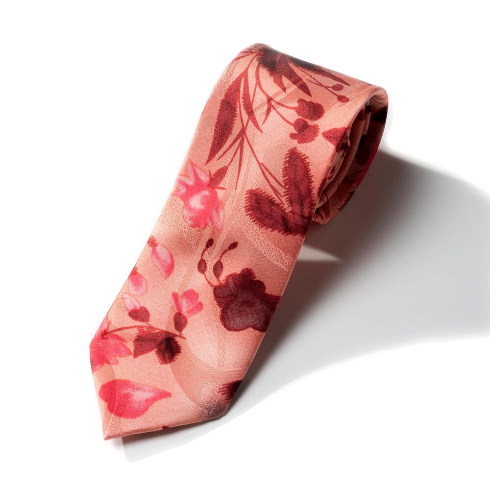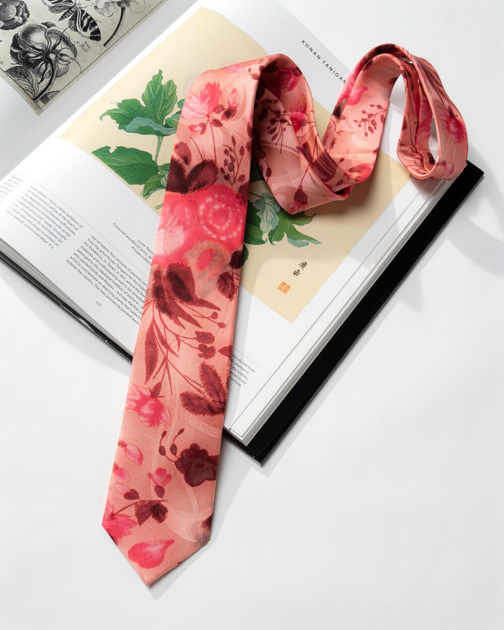 세련된 진홍빛으로 물든 색감이 우아한 분위기를 자아내는 실크 타이입니다. 기품 있는 오키드 플라워 드로잉은 동양 화풍의 분위기를 담고 있으며, 프리미엄 실크 원사가 레이어링 되어 더욱 다채로운 질감의 텍스쳐를 선사합니다.