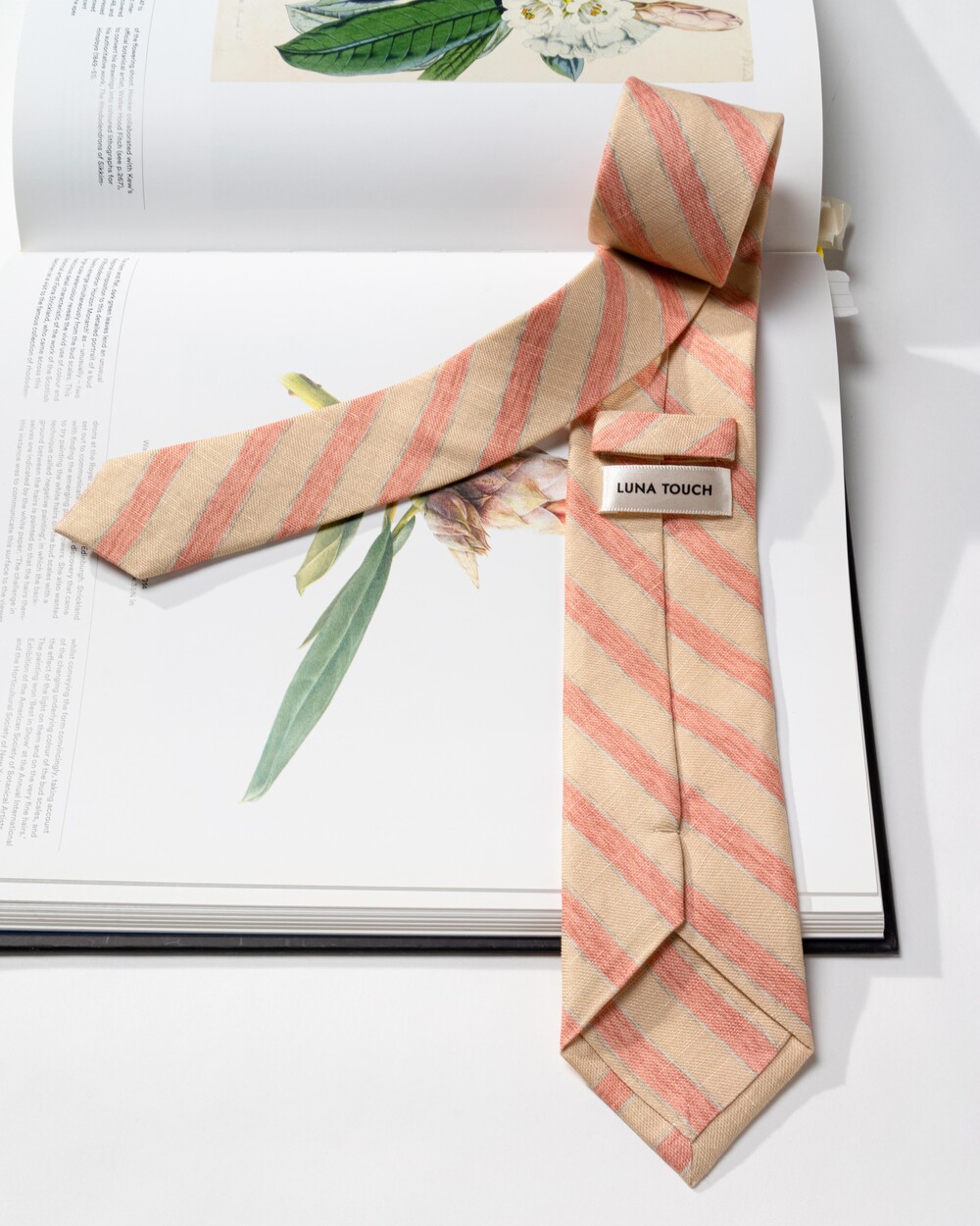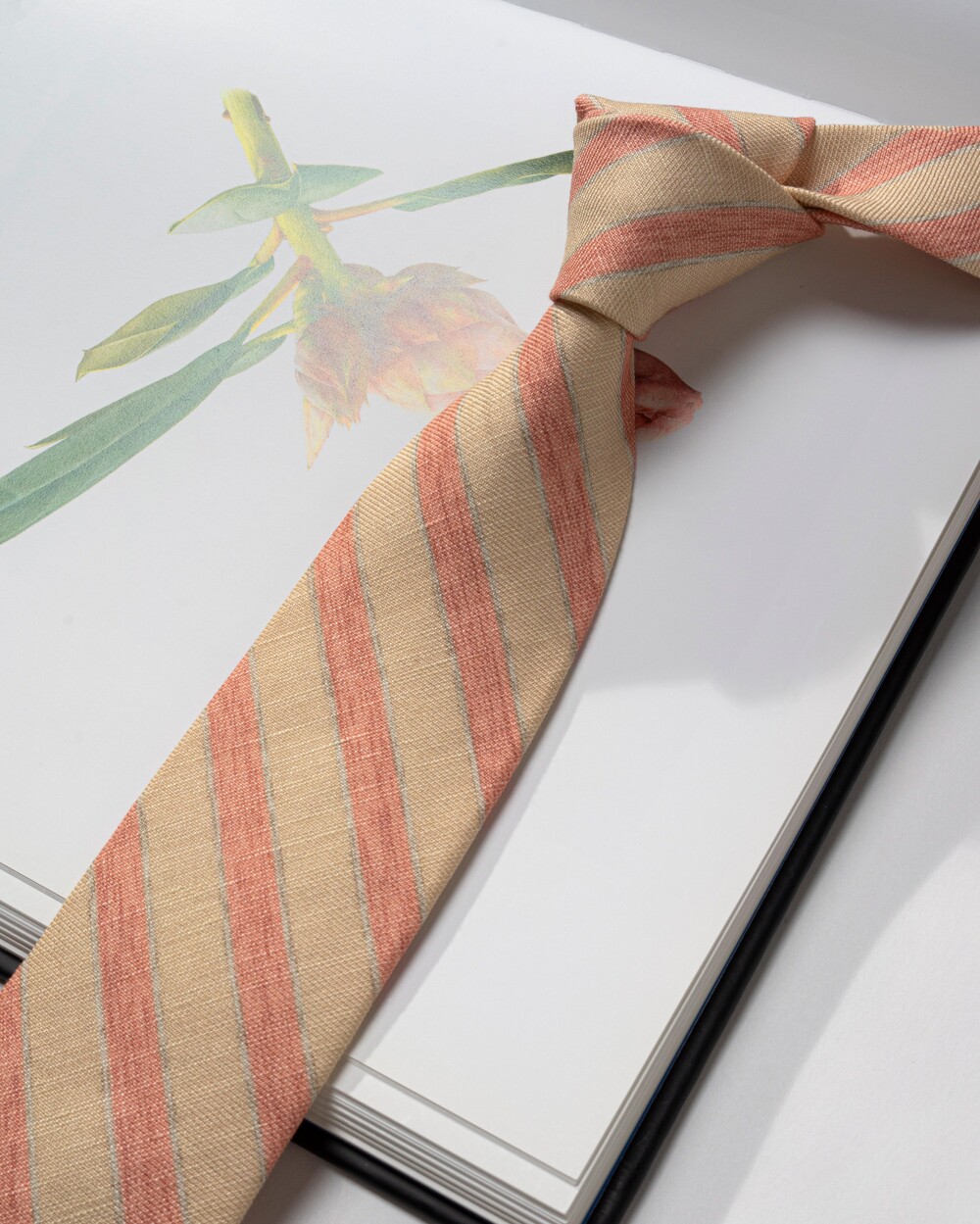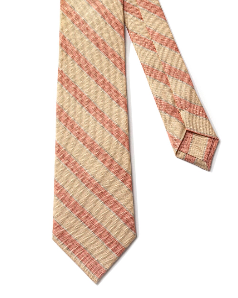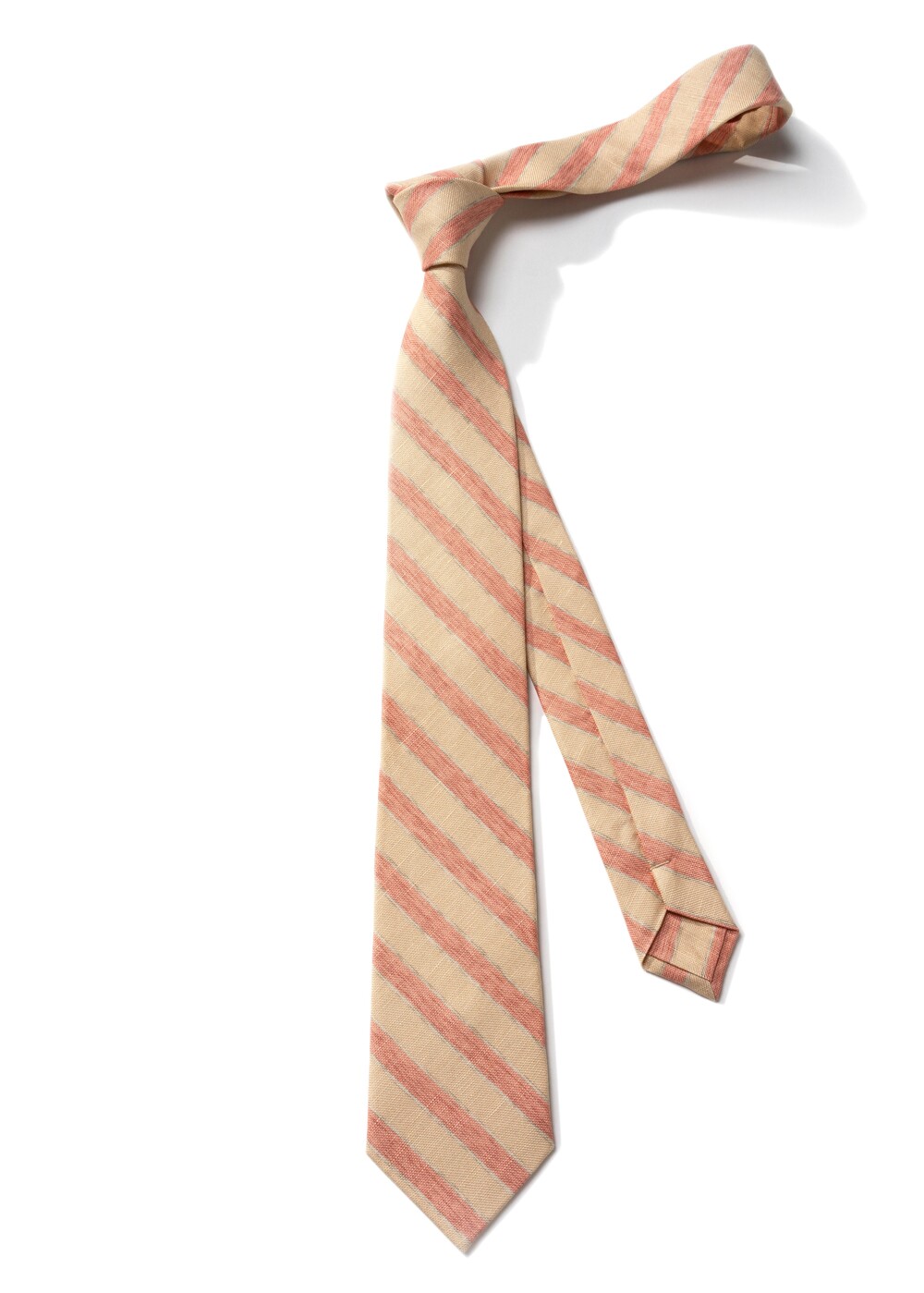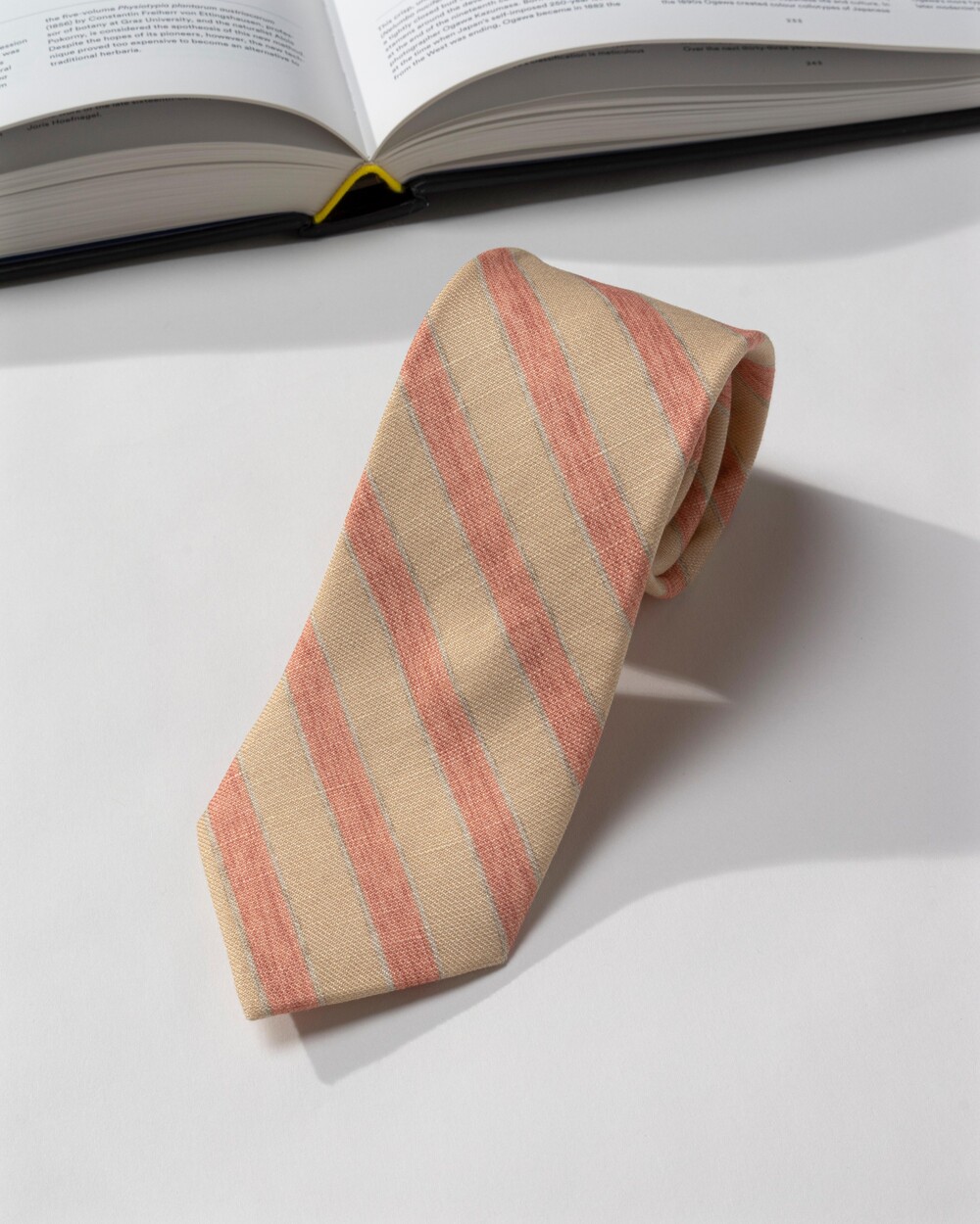 매력적인 드로잉 스트라이프 패턴의 이탈리안 실크 소재의 타이입니다. 살구빛과 다홍빛의 와이드한 스트라이프 패턴이 멋스러우며, 실크와 린넨 원사가 함께 직조된 매끄럽고 탄탄한 소재감과 질감 표현이 뛰어납니다. 가벼운 중량감과 마일드한 색감 조합으로 사계절 시즌 착용 가능합니다.