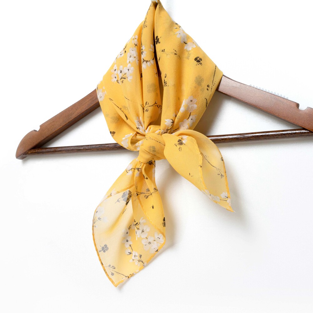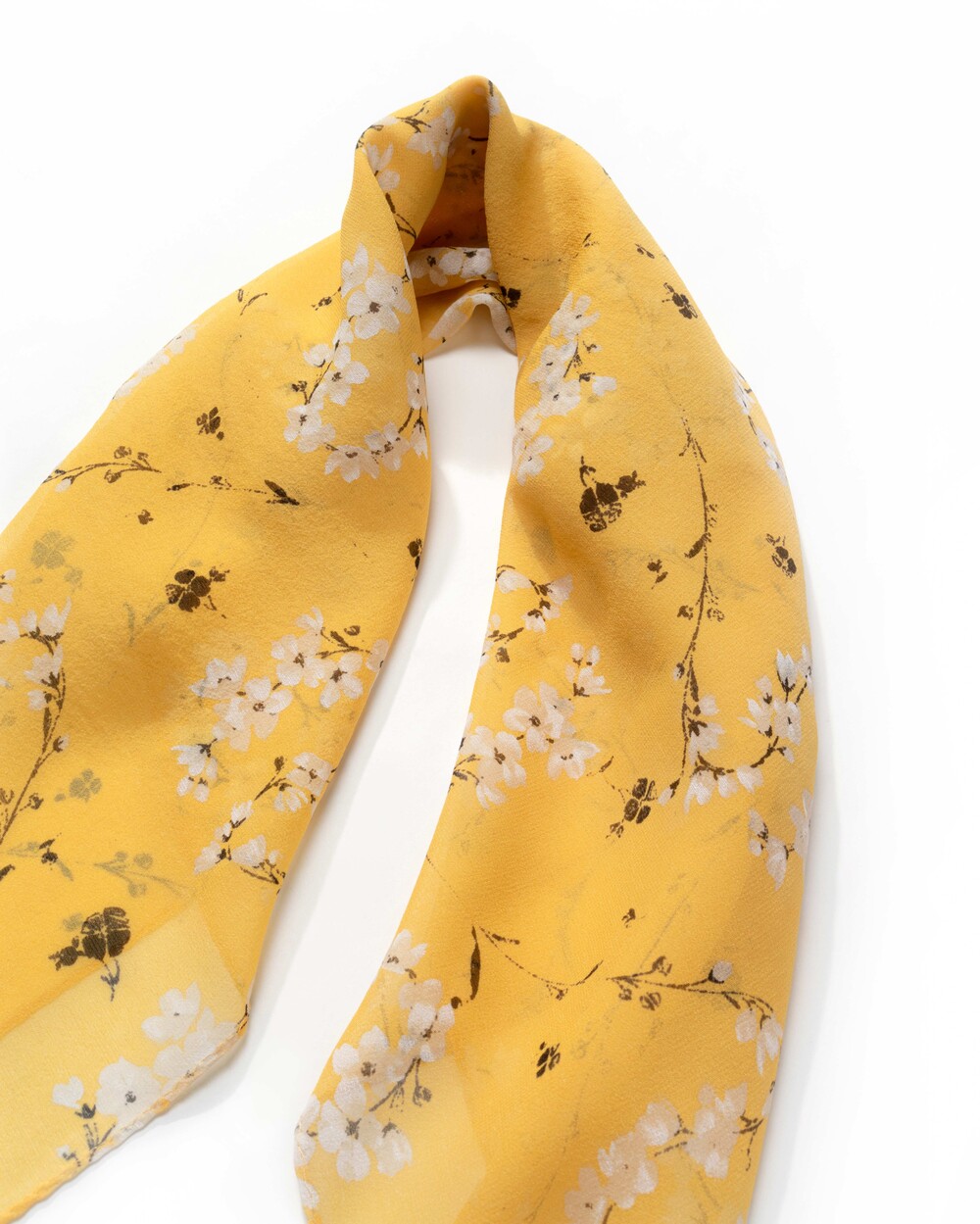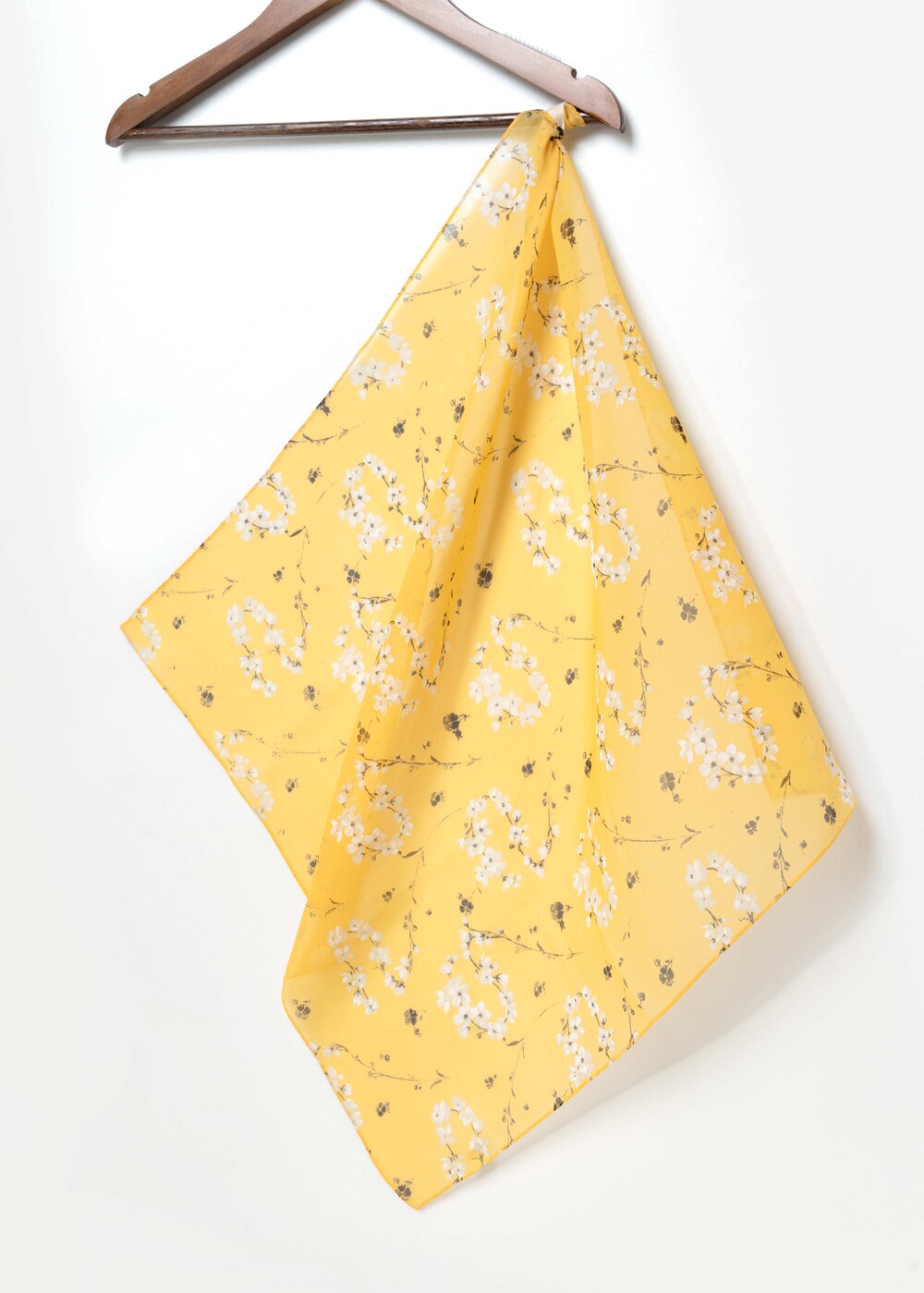 스퀘어 형태의 실크 스카프 입니다. 아리따운 레몬 옐로우 컬러에 한국적인 분위기의 드로잉 플라워 패턴이 더해져 우아한 분위기로 연출됩니다. 가볍고 산뜻한 촉감의 쉬폰 실크로 제작되어 사계절 구애 받지 않고 착용하기에 제격인 스카프 입니다.