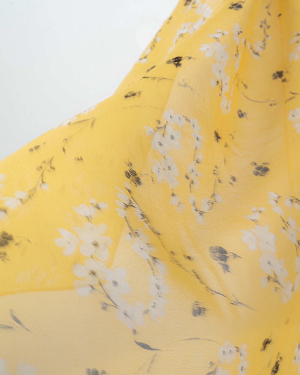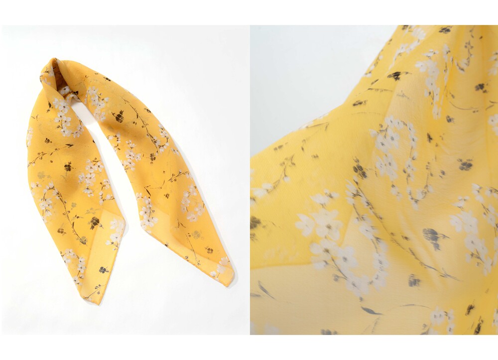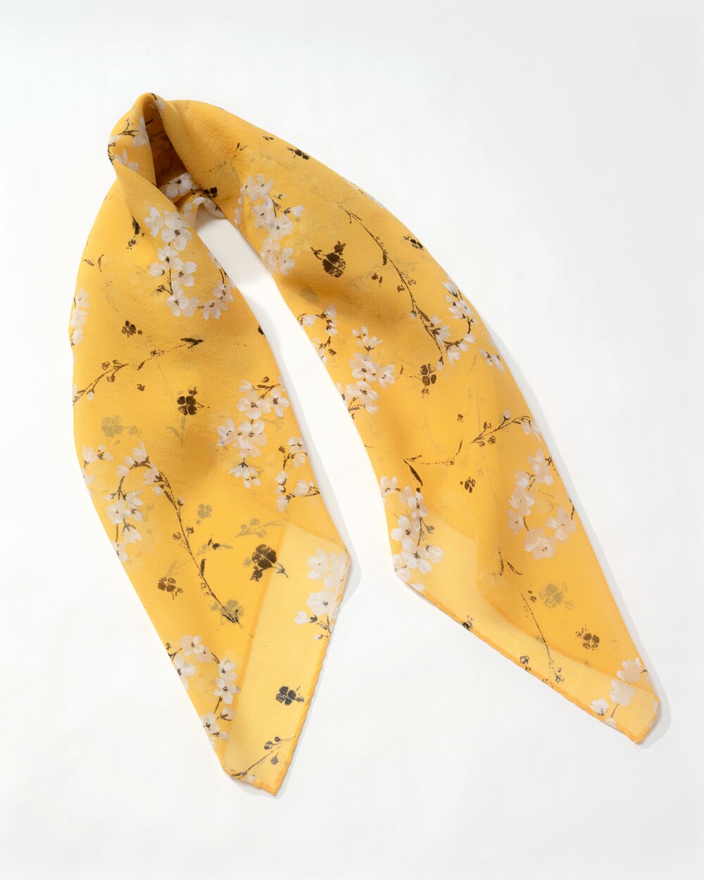 스퀘어 형태의 실크 스카프 입니다. 아리따운 레몬 옐로우 컬러에 한국적인 분위기의 드로잉 플라워 패턴이 더해져 우아한 분위기로 연출됩니다. 가볍고 산뜻한 촉감의 쉬폰 실크로 제작되어 사계절 구애 받지 않고 착용하기에 제격인 스카프 입니다.