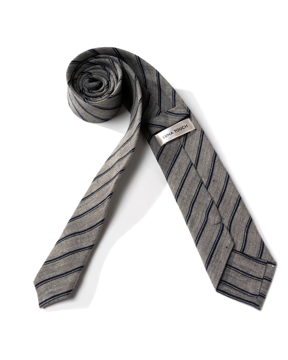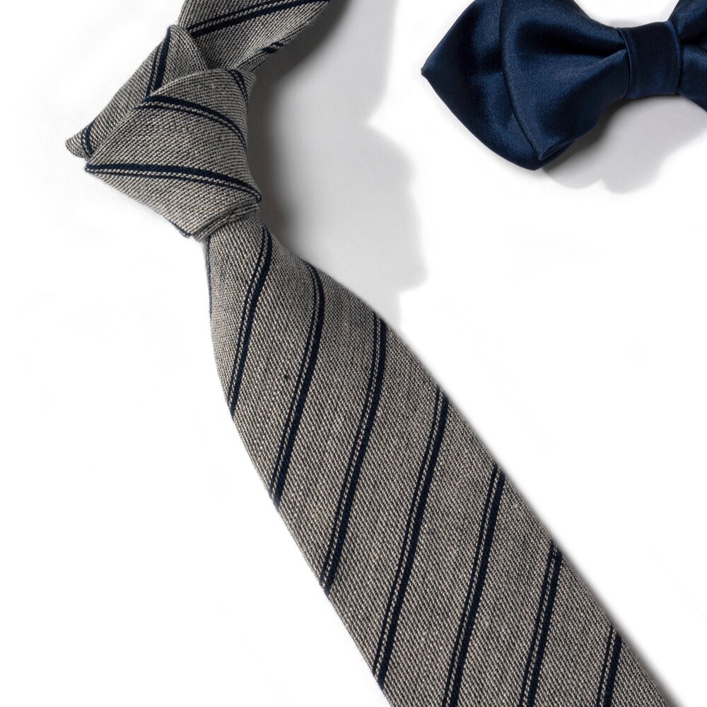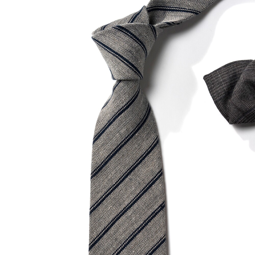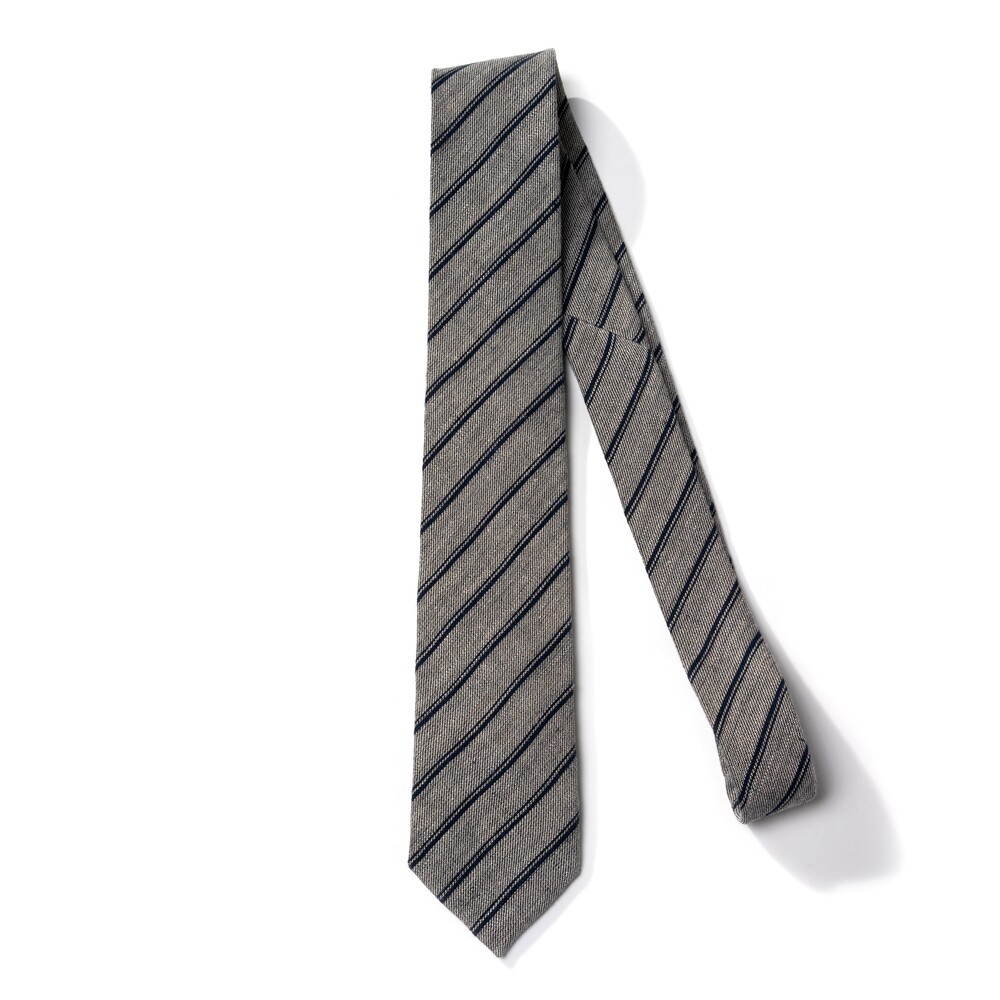 레일로드 더블 스트라이프 구성의 클래식한 타이입니다. 데이 타이로 사계절 시즌 착용하기 좋은 탄탄하고 내추럴한 질감이 살아있는 자연섬유 린넨 소재로 제작됩니다. 라이트 그레이 베이스에 네이비 스트라이프 포인트로 비즈니스, 캐주얼 룩 모두 범용성 높게 매치되어 유연한 연출이 가능합니다.