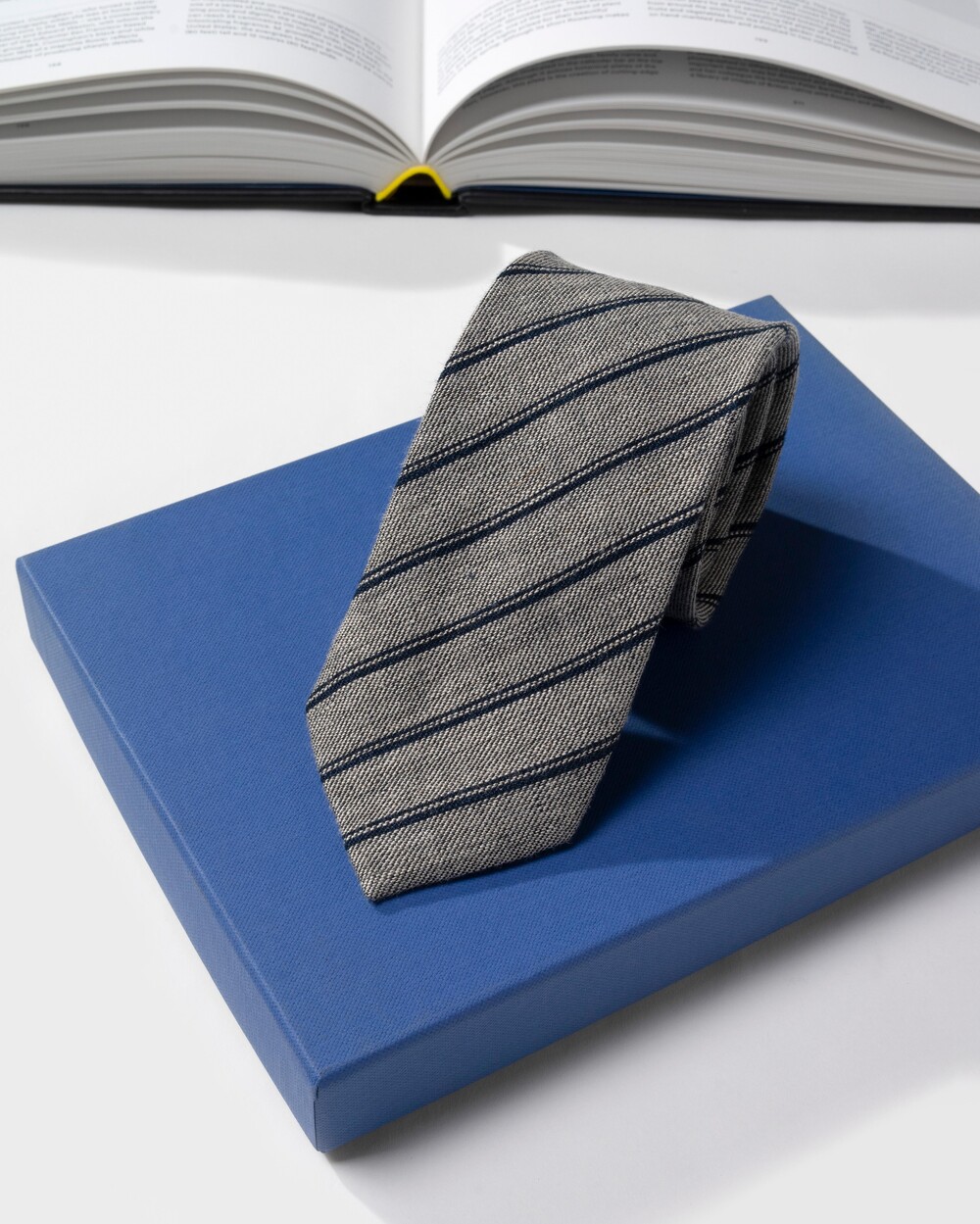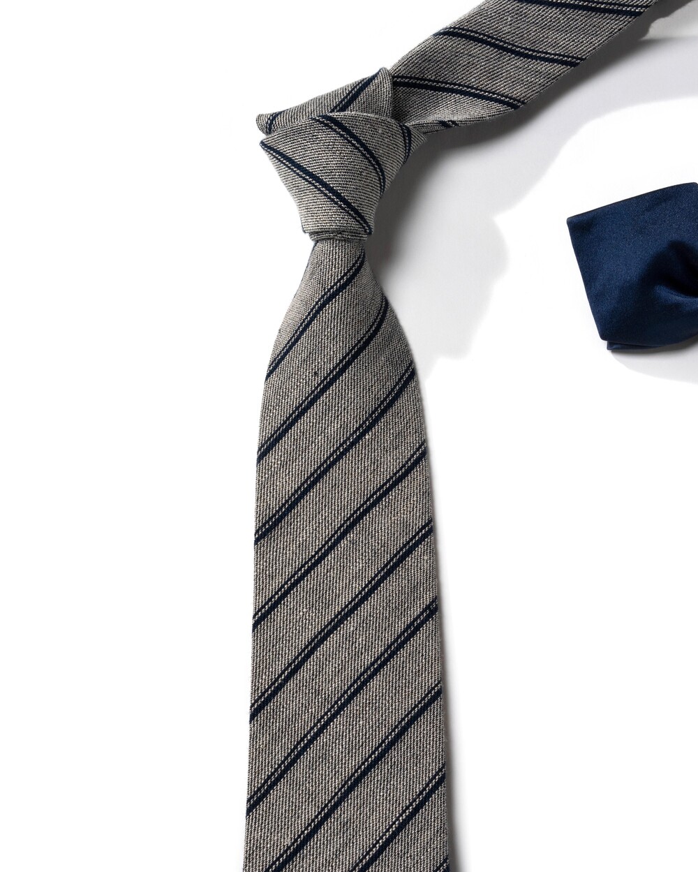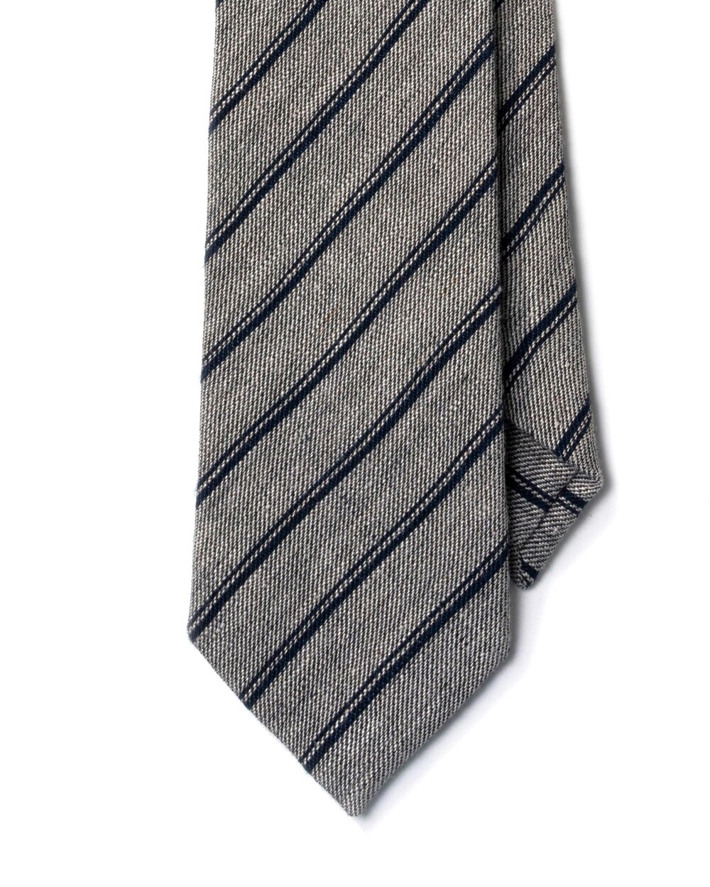 레일로드 더블 스트라이프 구성의 클래식한 타이입니다. 데이 타이로 사계절 시즌 착용하기 좋은 탄탄하고 내추럴한 질감이 살아있는 자연섬유 린넨 소재로 제작됩니다. 라이트 그레이 베이스에 네이비 스트라이프 포인트로 비즈니스, 캐주얼 룩 모두 범용성 높게 매치되어 유연한 연출이 가능합니다.