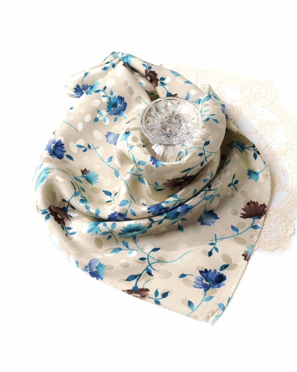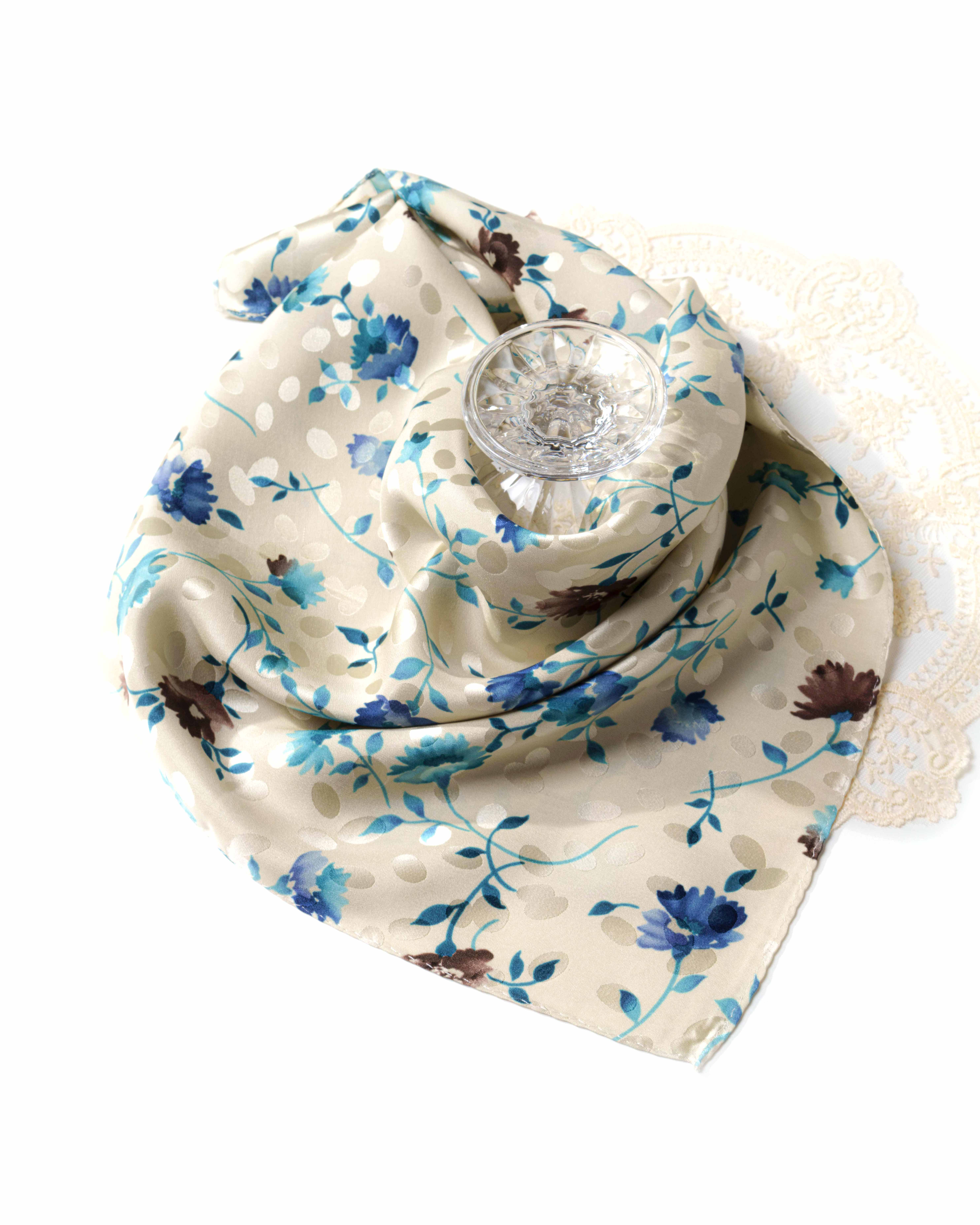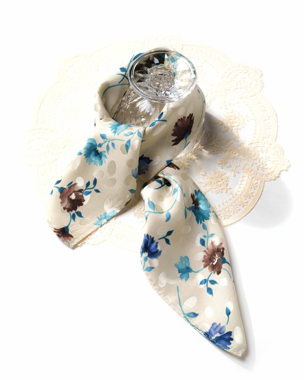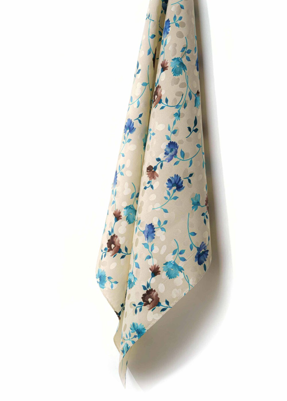 부드러운 크림 컬러 베이스에 워터컬러 드로잉 패턴으로 구성된 스카프 입니다. 채도감이 낮은 블루, 브라운 색감의 플라워 패턴으로 다양한 분위기로 착용 가능합니다. 도트 직조가 더해진 매끄럽고 부드러운 퓨어 실크 텍스쳐로 각도에 따른 은은한 반짝임이 아름다운 스카프 입니다.