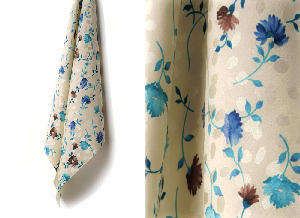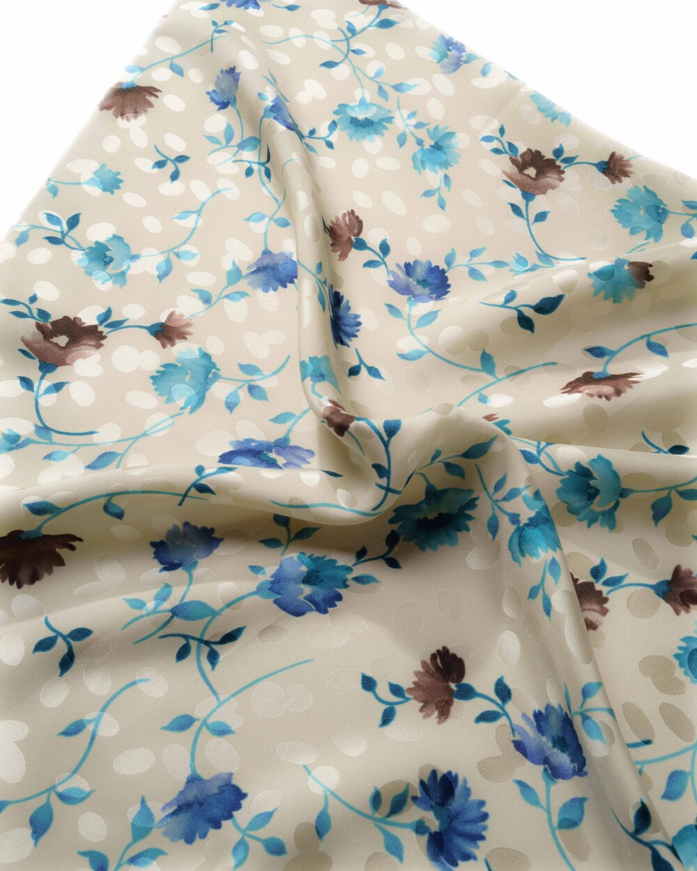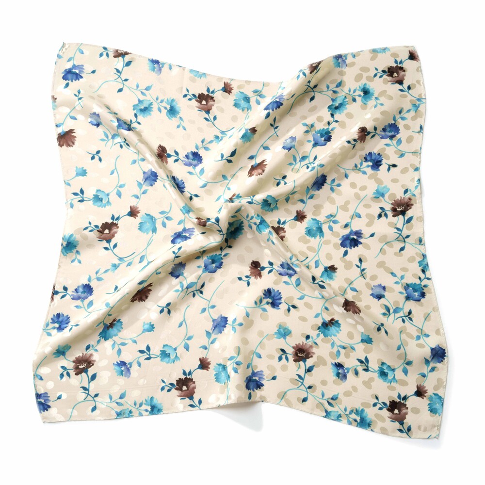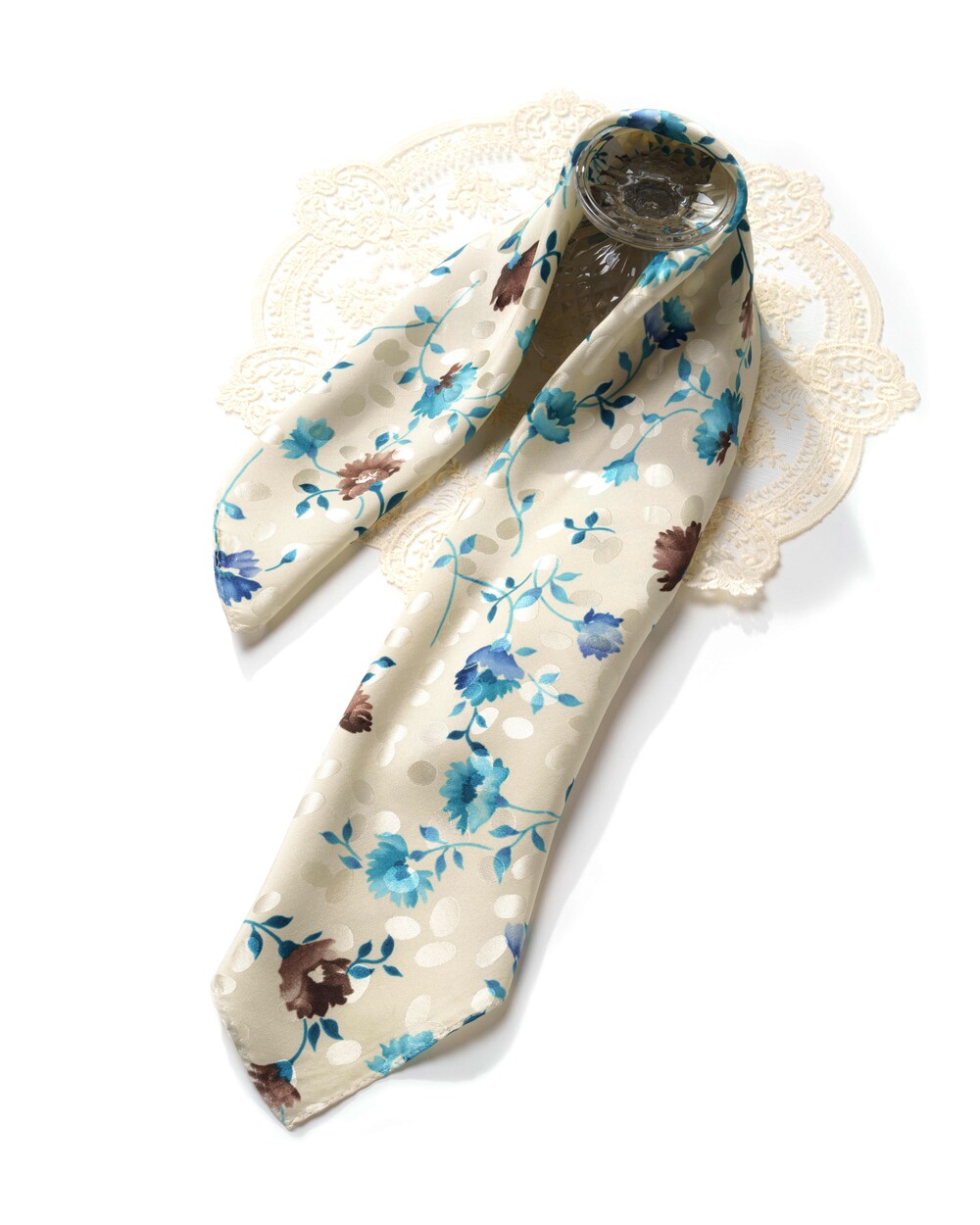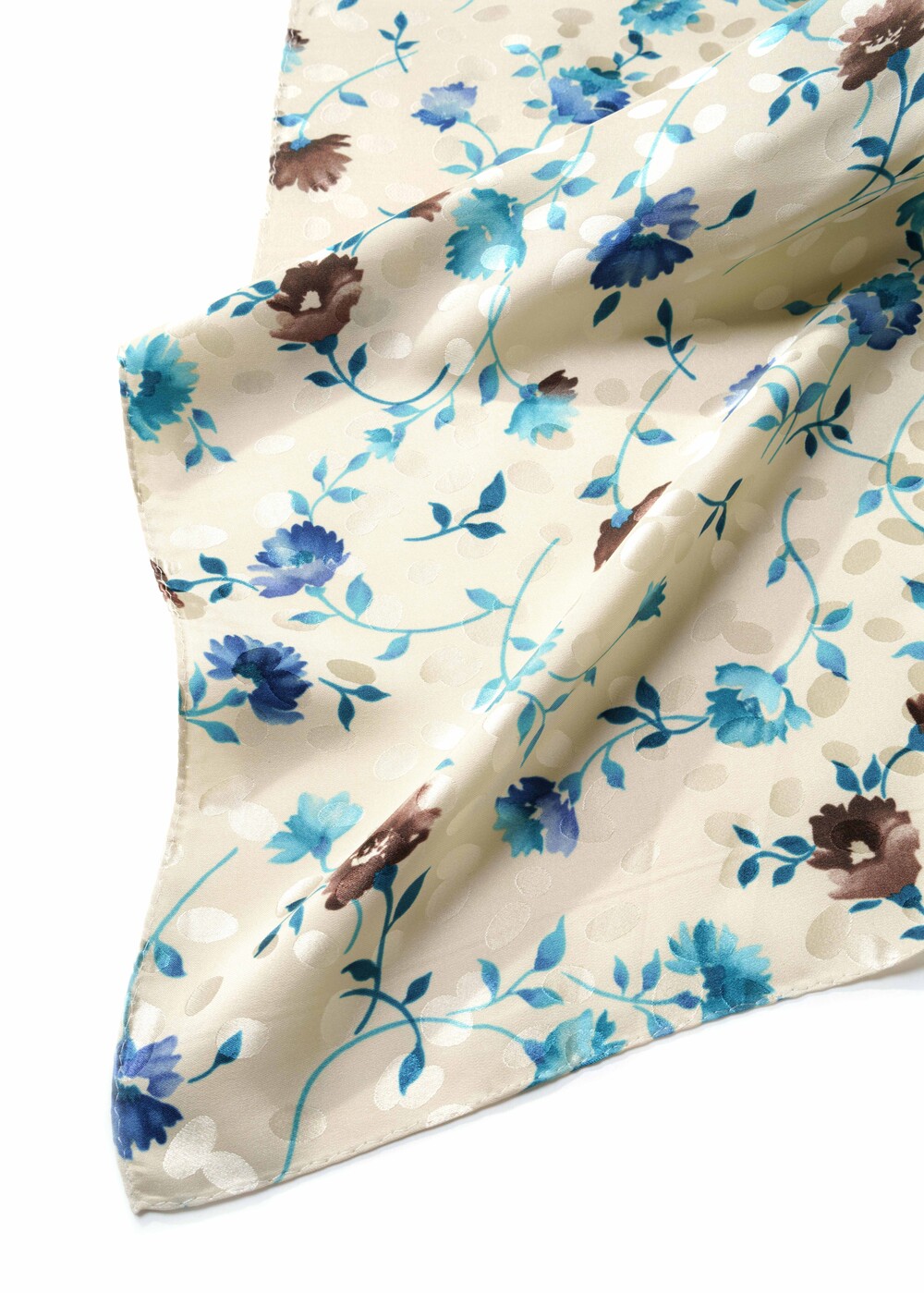 부드러운 크림 컬러 베이스에 워터컬러 드로잉 패턴으로 구성된 스카프 입니다. 채도감이 낮은 블루, 브라운 색감의 플라워 패턴으로 다양한 분위기로 착용 가능합니다. 도트 직조가 더해진 매끄럽고 부드러운 퓨어 실크 텍스쳐로 각도에 따른 은은한 반짝임이 아름다운 스카프 입니다.