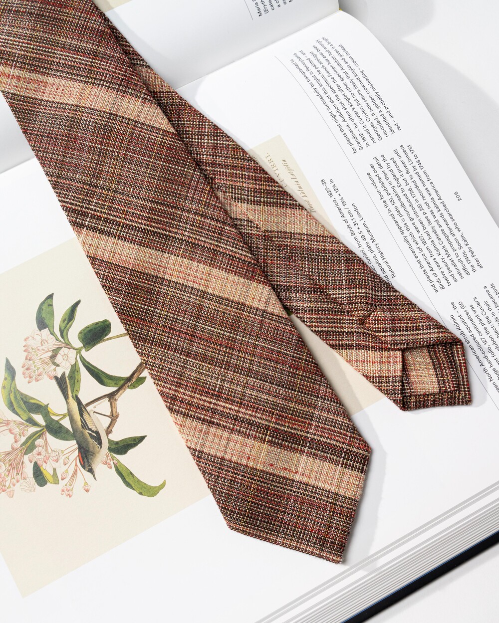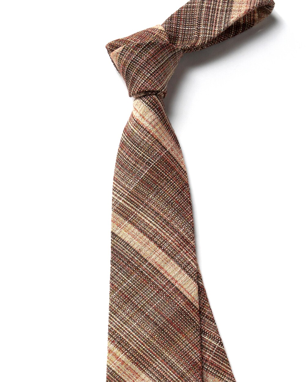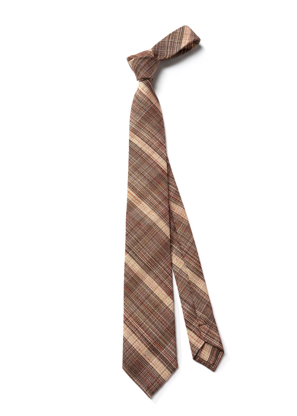 브라운, 베이지, 딥 레드 계열의 여러가지 색감의 원사가 베틀 직조로 견고하게 짜여진 이탈리안 울 블렌드 타이입니다. 내구성과 지속성이 뛰어나며, 울 원사를 베이스로 린넨 소재의 색실이 함께 스트라이프 패턴으로 직조되어 더욱 유연한 질감입니다. 사계절 시즌 착용 가능하며 FW 시즌과 잘 어울립니다.