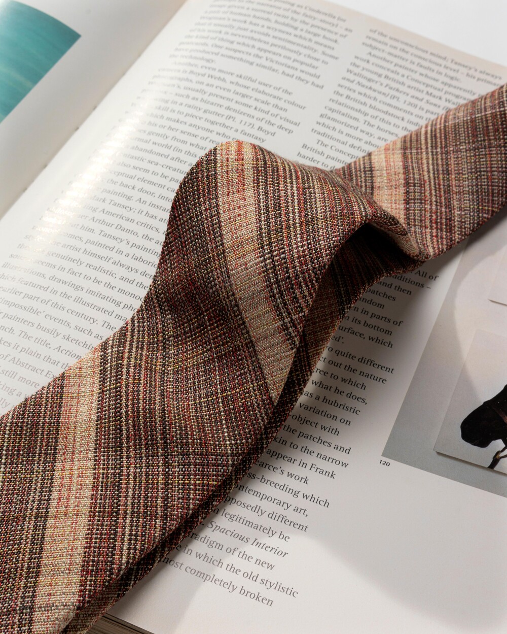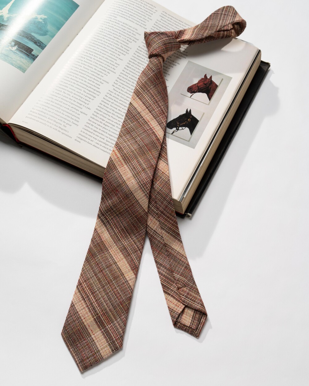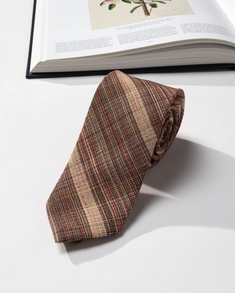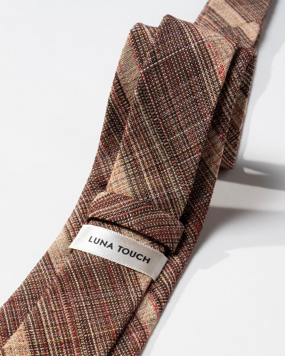 브라운, 베이지, 딥 레드 계열의 여러가지 색감의 원사가 베틀 직조로 견고하게 짜여진 이탈리안 울 블렌드 타이입니다. 내구성과 지속성이 뛰어나며, 울 원사를 베이스로 린넨 소재의 색실이 함께 스트라이프 패턴으로 직조되어 더욱 유연한 질감입니다. 사계절 시즌 착용 가능하며 FW 시즌과 잘 어울립니다.