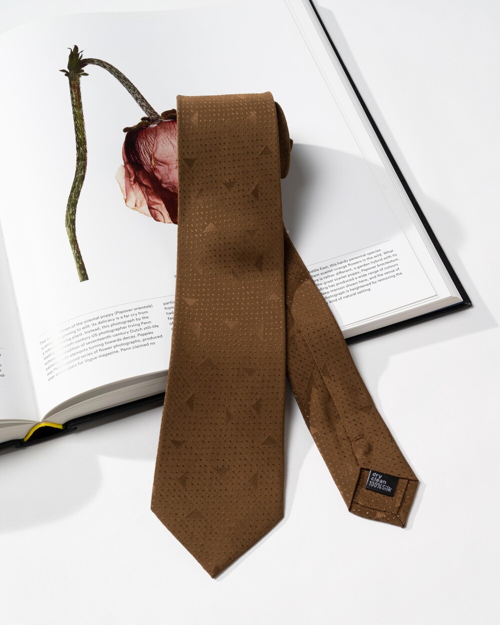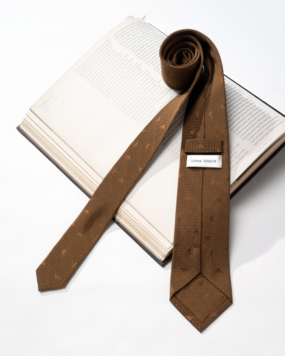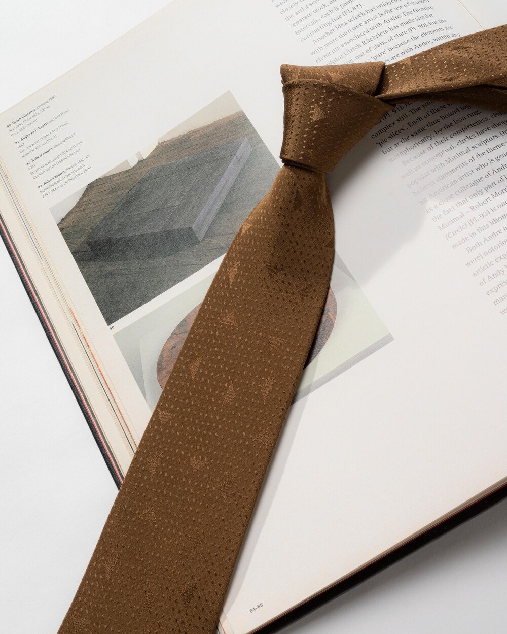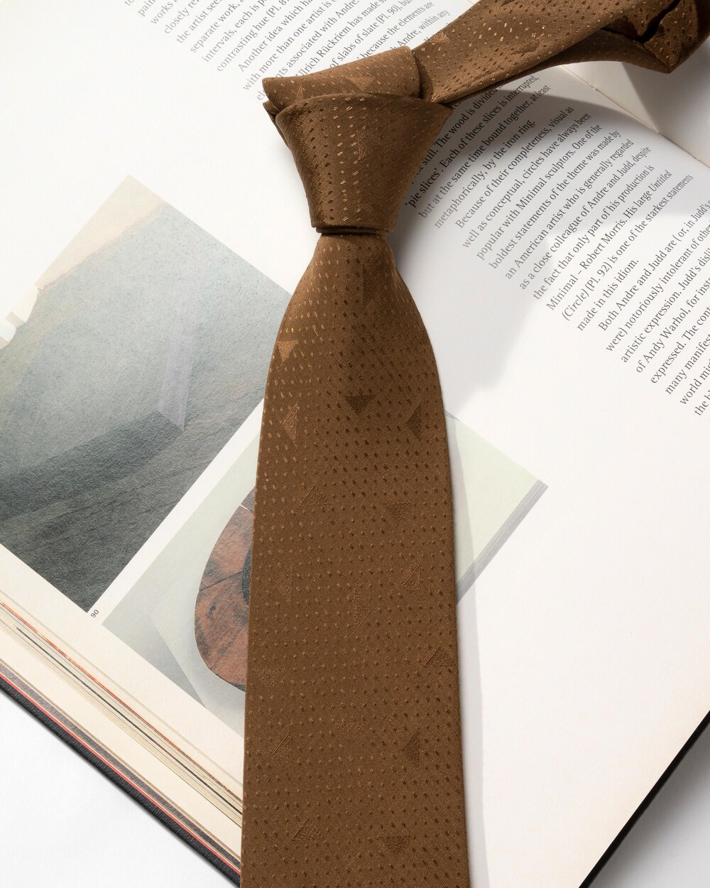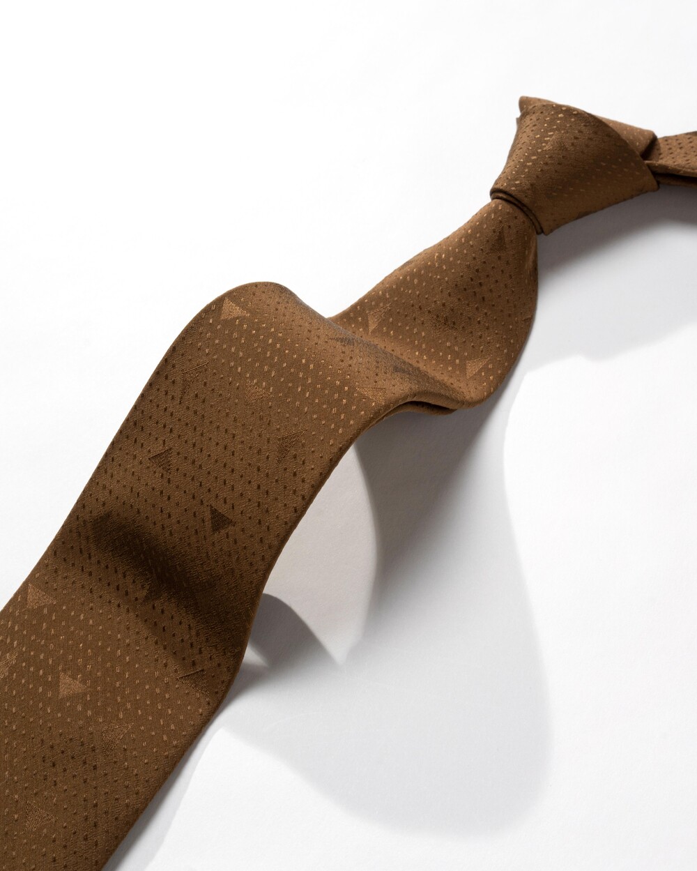 클래식한 샌드 브라운 컬러의 실크 타이 입니다. 트라이앵글 프레임의 구조적인 형태감과 스티치 짜임으로 직조된 도트 패턴으로 제작되었습니다. 매트한 베이스의 질감에 패턴은 광택감 있게 표현되어 각도에 따라 변모하는 텍스쳐가 돋보이는 타이입니다.